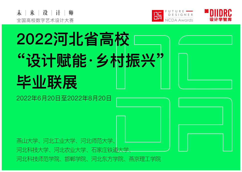 【新闻中心讯】6月20日至8月20日,燕山大学艺术与设计学院联合未来设计师NCDA大赛组委会,举办“2022未来设计师高校毕业设计作品省级云展”。 该活动由我校牵头,联合河北省主要骨干院校,征集作品200余项,通过全国NCDA设计大赛平台进行全国推广,主要展示河北省高校在乡村振兴、艺术设计等方面的教学成果,加强省内兄弟院校之间的交流,提高艺术赋能我省乡村振兴的影响力,引领河北设计。