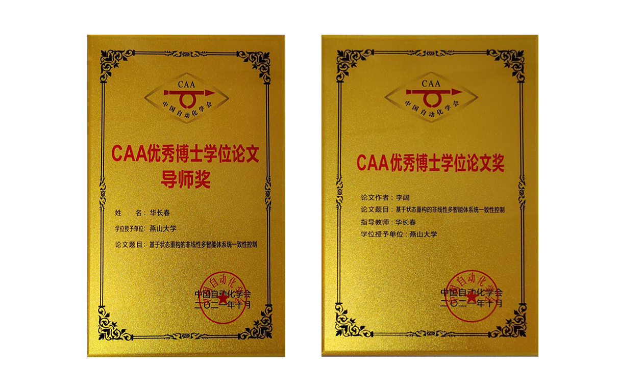 【新闻中心讯】近日,由中国自动化学会(CAA)主办,中国科学院自动化研究所承办的2021中国自动化大会在云南昆明召开。我校电气工程学院控制科学与工程专业2018级博士李阔同学的博士学位论文《基于状态重构的非线性多智能体系统一致性控制》荣获2021年度CAA优秀博士学位论文奖,其指导教师华长春教授荣获CAA优秀博士学位论文导师奖。这是中国自动化学会2014年设立该奖项以来燕山大学首次获得殊荣。