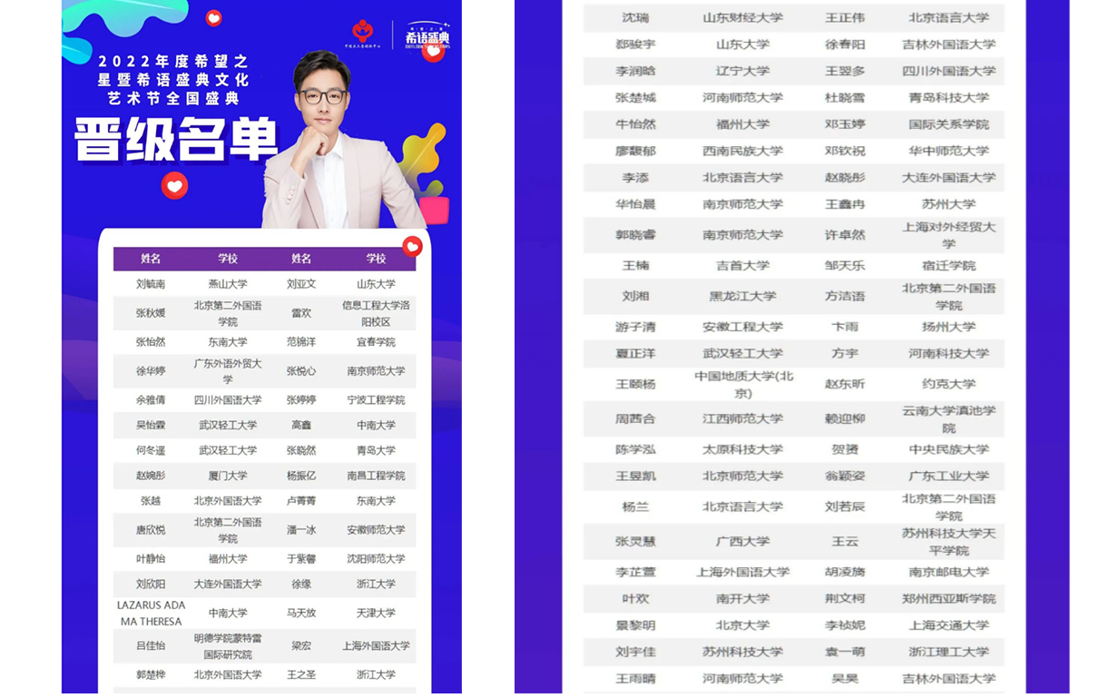 “希望之星”英语风采大赛(以下简称大赛)是在2000年由中央电视台创办,面向全国观众的大型电视英语比赛,自2000年已成功举办22届全国比赛。2022年大赛,由中国关工委主办,英语周报协办,是燕山大学首次进入该竞赛全国总决赛并获得优异成绩。