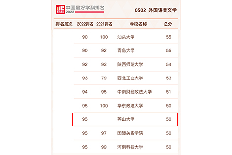 本次软科排名,外国语言文学学科全国共有120所大学上榜,河北省仅有燕山大学和河北师范大学两所高校上榜,标志着我校外国语言文学学科建设上了一个新台阶。本次软科排名取得好成绩,极大增强了我院全体师生搞好学科建设的信心,提振了全身心投入学科建设的士气。外国语学院将从人才培养、科研项目、成果获奖、乐竞体育在线论文、乐竞体育在线人才等五个方面继续深入做好外语语言文学学科建设,凝心聚力担使命,踔厉奋发谱新篇。(编辑 褚玉晶)