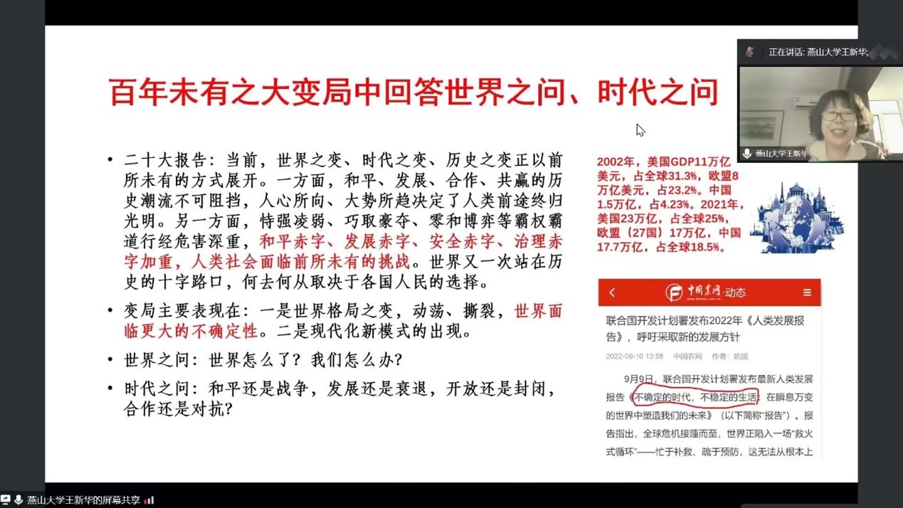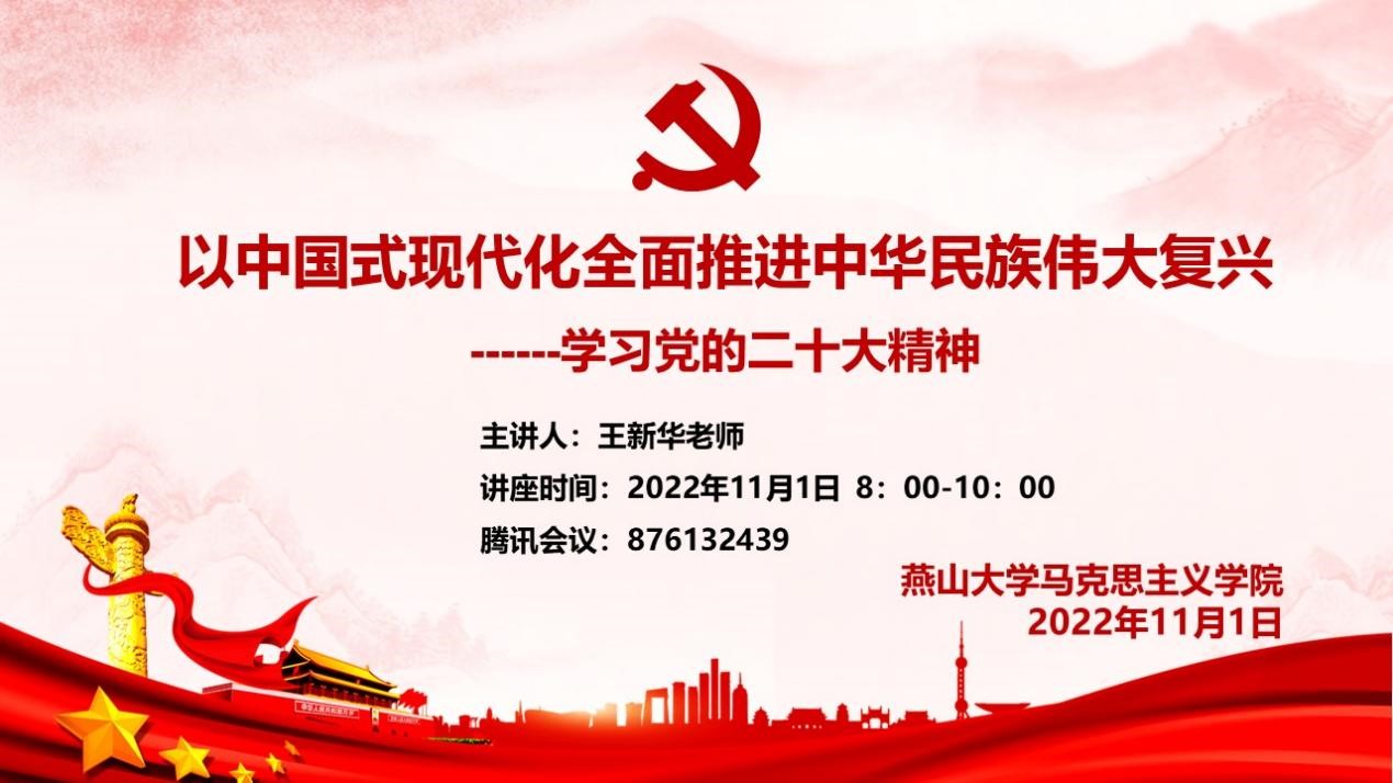 【新闻中心讯】为引导广大青年学生全面深刻领会党的二十大精神,2022年11月1日上午8点,燕山大学马克思主义学院党委书记王新华教授给全院研究生主讲了《以中国式现代化全面推进中华民族伟大复兴——学习党的二十大精神》的主题党课。
