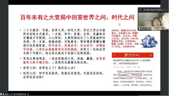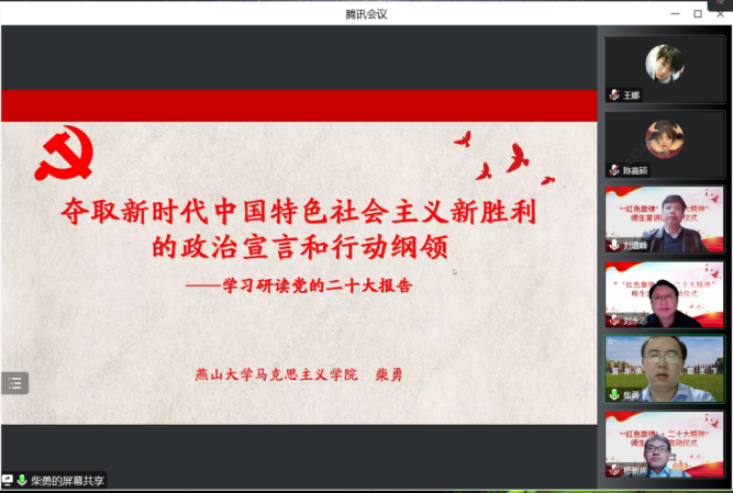 11月10日晚,学院“红色旋律”讲坛活动举办学习党的二十大精神线上专题讲座, 柴勇教授作了题为《夺取中国特色社会主义新胜利的政治宣言和行动纲领——学习党的二十大报告》的辅导报告。开讲前半个小时,容纳2000人的腾讯会议室爆满,临时又增开一间才满足了需要。柴勇教授结合自身学习心得体会与大家分享交流了学习党的二十大报告的方法和一系列参考文献。