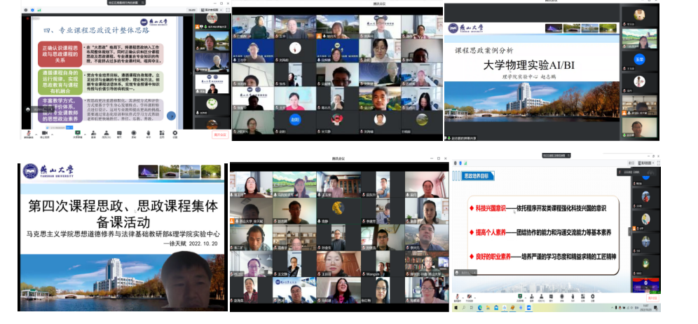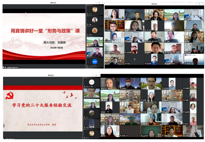 在教务处的大力支持下,学院积极开展思政课程与课程思政“双向融合”集体备课,在“全员育人”的“大思政课”格局中推进党的二十大精神“三进”。党的二十大召开前,学院已同6个学院的29个基层教学组织对接开展课程思政与思政课程“双向融合”联合备课教研活动。党的二十大召开后,学院将在专业课程中融入党的二十大精神作为当前和今后一个时期联合集体备课的重要议题。10月20日学院各教研部与理学院、经济管理学院的11个基层教学组织合作举办课程思政与思政课程“双向融合”联合备课教研活动,马克思主义学院思政课老师结合党的二十大报告的相关内容,对专业课程思政元素的选取、呈现提出意见、建议,同时提醒专业课教师课程思政要树立政治意识,认真学习党的二十大精神,确保理解准确、融入自然、成效明显。学院还将继续围绕党的二十大精神融入课程思政与其他学院进行联合集体备课,实现“双向融合”集体备课燕山大学全覆盖。