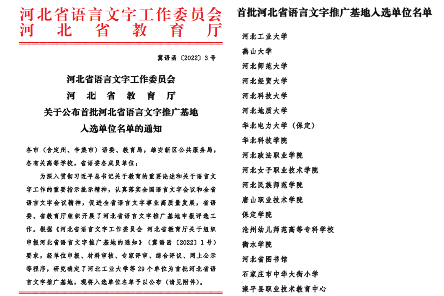 【新闻中心讯】为深入贯彻习近平总书记关于教育的重要论述和关于语言文字工作的重要指示批示精神,认真落实全国语言文字会议和全省语言文字会议精神,促进全省语言文字事业高质量发展,省语委、省教育厅组织开展了首批河北省语言文字推广基地申报评选工作。经单位申报、材料审核、专家评审、综合评议、网上公示等程序,确定29个单位为首批河北省语言文字推广基地(冀语函〔2022〕3号),燕山大学成功入选。