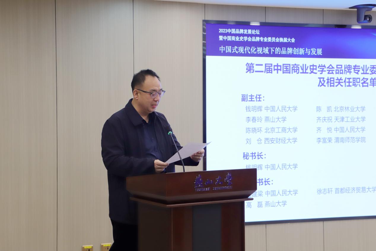 郭国庆教授在致辞中表示,燕山大学作为省、部共建的全国重点大学,对服务国家科技进步和区域经济发展做出了重要贡献。近年来,燕山大学经济管理学院更是结合优势学科基础,在品牌研究和人才培养方面成果突出。本次大会由燕山大学经管学院承办,充分展示了燕大经管学院的科研实力。郭教授希望新一届品牌专业委员会能够继续努力,立足中国品牌发展实际,搭建共享平台,深化推进相关领域专家的交流与合作,为中国式现代化贡献力量。最后,郭国庆教授宣布新一届专委会成员构成情况及相关任职名单。
