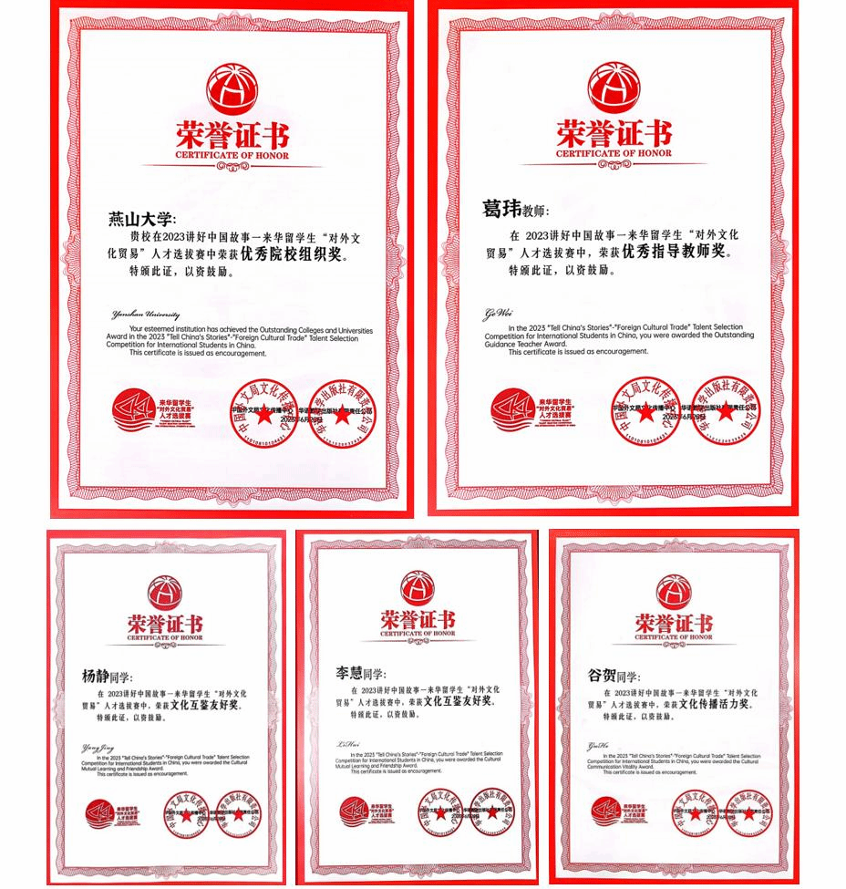 燕山大学国际教育学院在此次大赛中获奖充分展示了学院人才培养的可喜成果。未来,我校将持续聚焦关注来华留学生培养,全面探索与创新中国文化与贸易海外发展之路,推进学校来华留学生教育高质量内涵式发展,讲好中国故事,展现更为全面、真实、立体的中国形象,为推动中华文化走出去、提升中华文化影响力持续贡献力量。(编辑 褚玉晶)