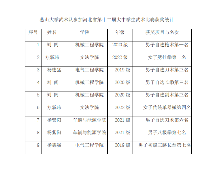 我校武术队自春季学期开学以来,在教练员赵文楠老师的带领下,开始进行系统的训练,为备战本次比赛,更是制定了科学严谨的备战计划。比赛成绩的取得充分展示出我校体育教学水平和燕大学子敢担当、能吃苦、肯奋斗的精神风貌。