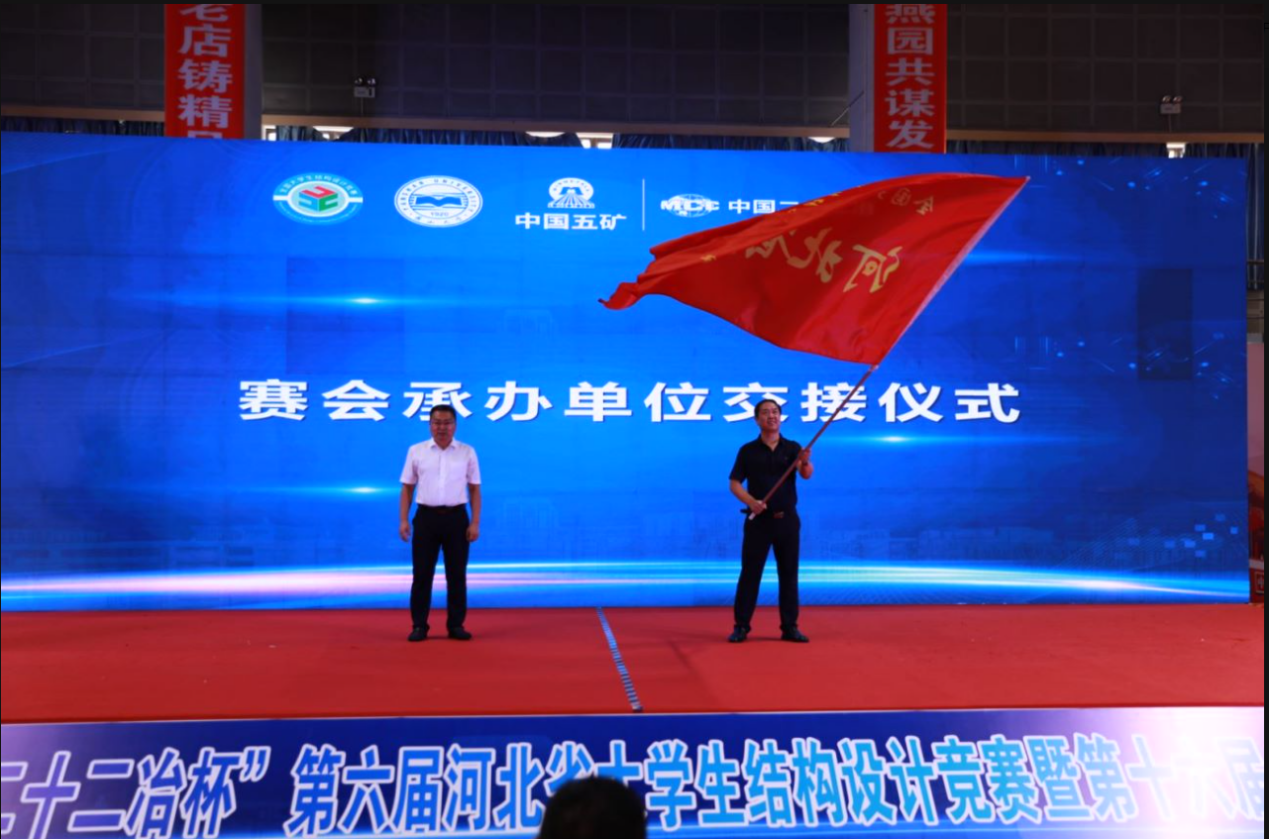 7月11日下午16:30,举行大赛闭幕式。评审专家组组长李慧剑教授对大赛进行了精彩的点评,燕山大学建筑工程与力学学院院长赵庆新致感谢辞。中国二十二冶集团有限公司总工程师慈国强等与会领导为获奖单位和个人颁奖。河北省土建类教学指导委员会秘书长王明生致闭幕辞并主持了承办单位交接仪式。本次竞赛在《歌唱祖国》昂扬悠远的旋律中圆满落幕。