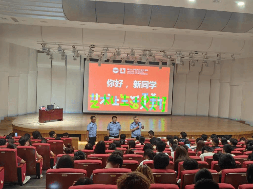 【新闻中心讯】为了增强2023级新同学的安全意识,宣传普及国家安全知识,汇聚维护国家安全的强大力量;加强自我防范意识,提高识骗防骗能力;提高大学生自觉抵制毒品的能力,增强识毒、防毒、拒毒意识。9月2日下午,艺术与设计学院邀请秦皇岛市公安局海港分局燕园派出所民警王宝军、反诈中心民警田拓、禁毒大队民警潘月在燕山大学音乐厅为同学们开展了一堂生动的安全教育课。学院2023级全体新同学参加了活动。