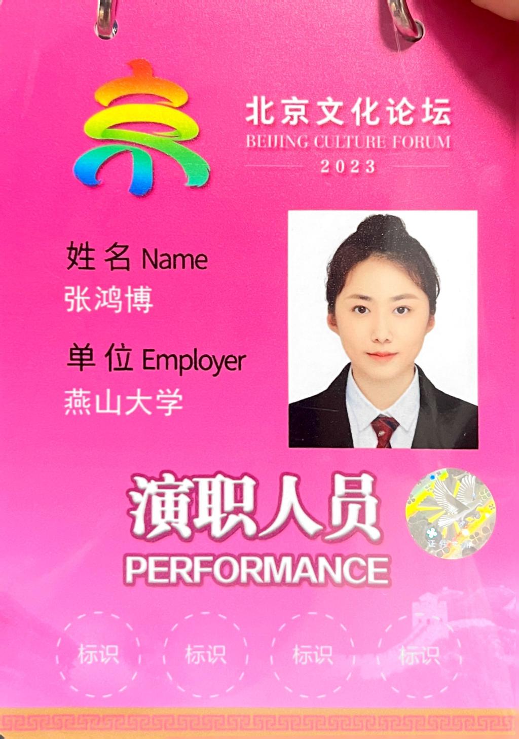 体育学院学生张鸿博受邀参加2023北京文化论坛文艺晚会,参与《携手向未来》节目的录制,向世界展现中国青年朝气蓬勃、积极向上的精神面貌以及中国人民各美其美、美美与共的崇高理想表达中国人民与世界人民携手并肩、共创未来的坚定决心,为推动人类文明发展进步贡献力量。