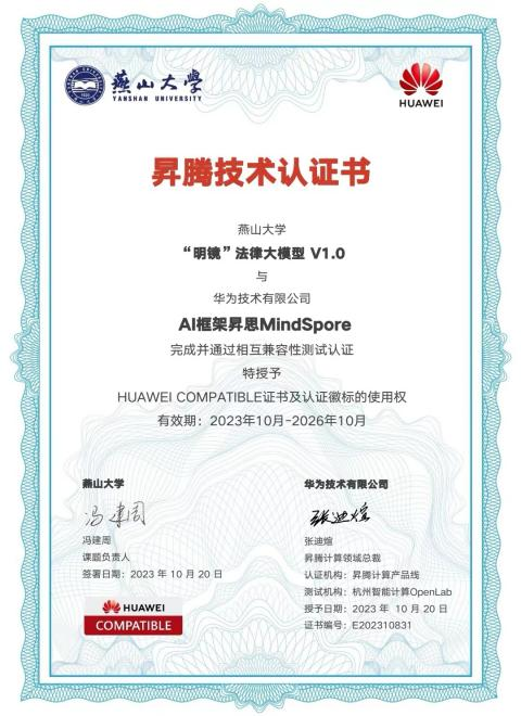 【新闻中心讯】近日,由我校信息科学与工程学院(软件学院)教师冯建周课题组研发的法律大模型“明镜”成功上线河北人工智能计算中心,并通过华为昇腾技术认证,标志着我校在自主人工智能大模型应用领域中开启新篇章。