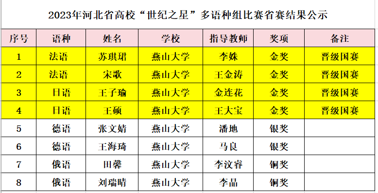 【新闻中心讯】10月15日,2023年“外研社·国才杯”“理解当代中国”全国大学生外语能力大赛多语种大赛省赛落下帷幕,外国语学院学生从河北省百所高校的参赛者中脱颖而出,法语专业学生苏琪珺、宋歌,日语专业学生王子瑜、王硕等四名同学均斩获该组别大赛金奖,成功晋级多语种组国赛。其他多语种赛项德语组获得省赛银奖,俄语组获得省赛铜奖。本次全国大学生外语能力大赛多语种大赛,燕山大学外国语学院学生大放异彩。