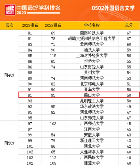 燕山大学外国语言文学跻身软科“中国最好学科排名榜”全国百强
