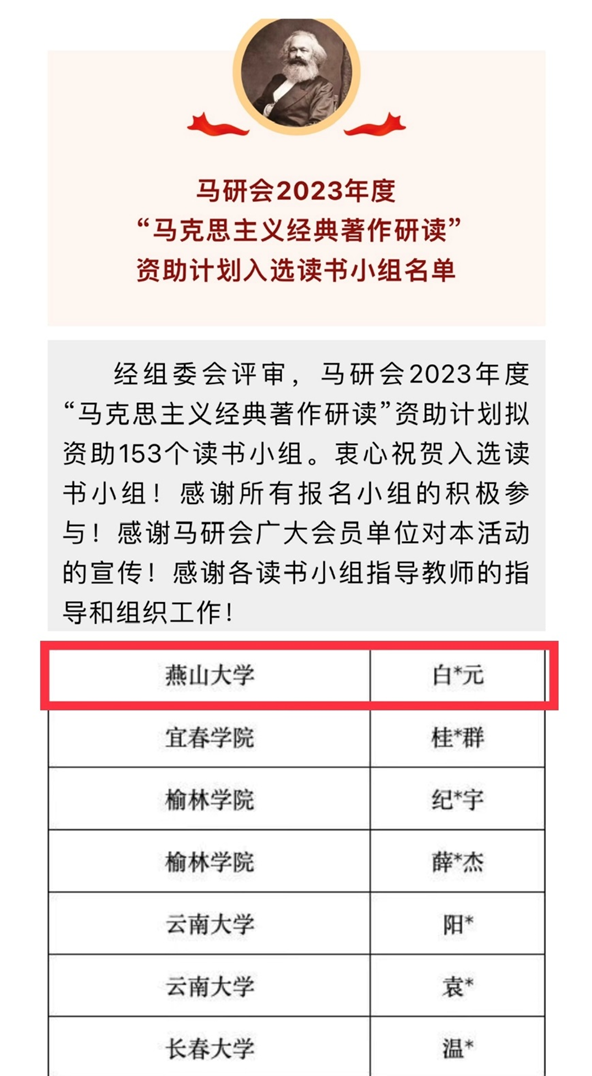 燕山大学马克思主义学院首次入选该资助计划,体现了学院对学生研读马克思主义经典著作的重视和人才培养工作的实效。未来,学院将鼓励更多学生积极开展马克思主义经典研读活动,读原著、学原文、悟原理,以学铸魂,练好内功、提升修养、增强本领,提升学生运用马克思主义立场观点方法分析问题和解决问题的能力。(编辑 高慧渊)
