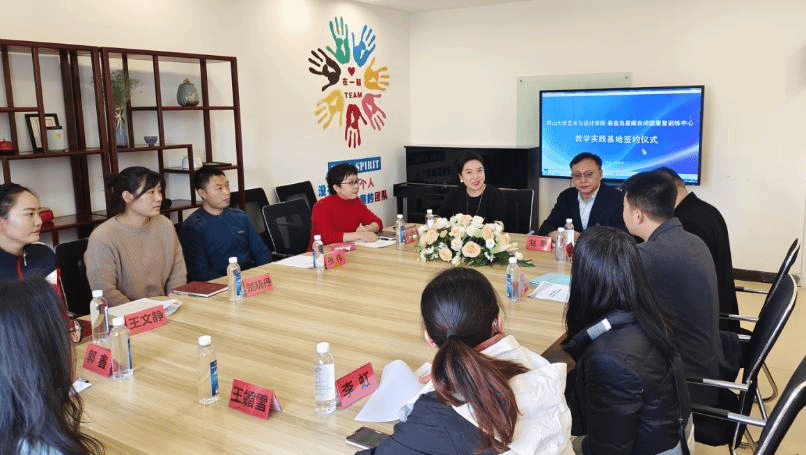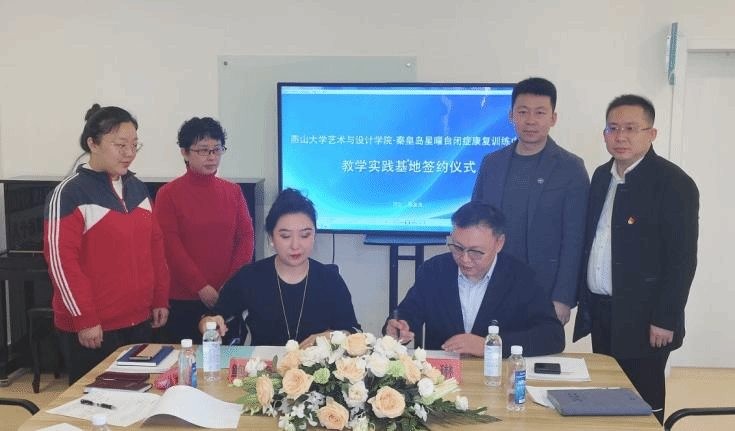 会后,赵琳院长、工业设计系党支部李虹书记分别代表学院和支部与星耀自闭症康复训练中心签订了校企合作协议,赵琳院长与鲍琳静校长长共同为“燕山大学艺术与设计学院—星耀自闭症康复训练中心教学实践基地”揭牌。