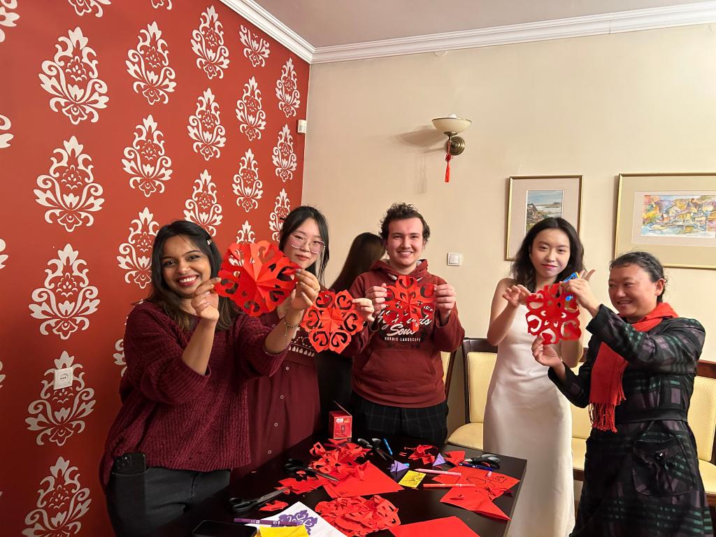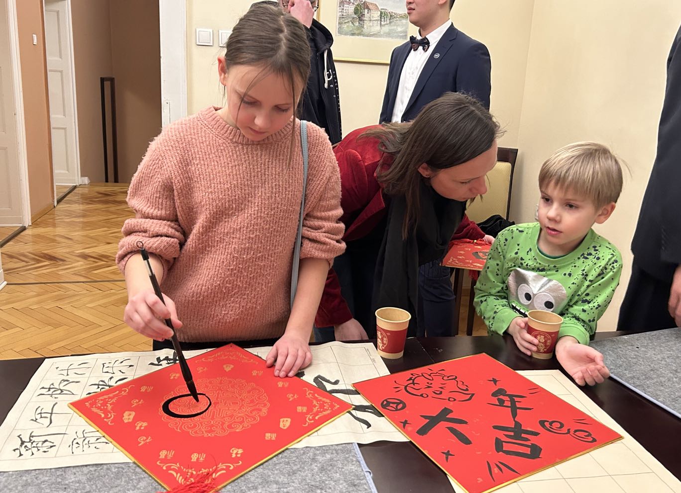 在活动中,别开生面地设计了“波澜祈福”游戏,通过传统的击鼓传花游戏邀请波兰来宾学习中国春节吉祥话,在一声声温暖的祝福中进一步加深了中波两国师生的情谊。活动还组织了丰富多彩的剪纸、书法等文化体验环节,中波师生在欢愉浓厚的节日氛围中共写福字、同剪窗花、合庆新春,为甲辰龙年的到来镀上一层特殊的异国风味。