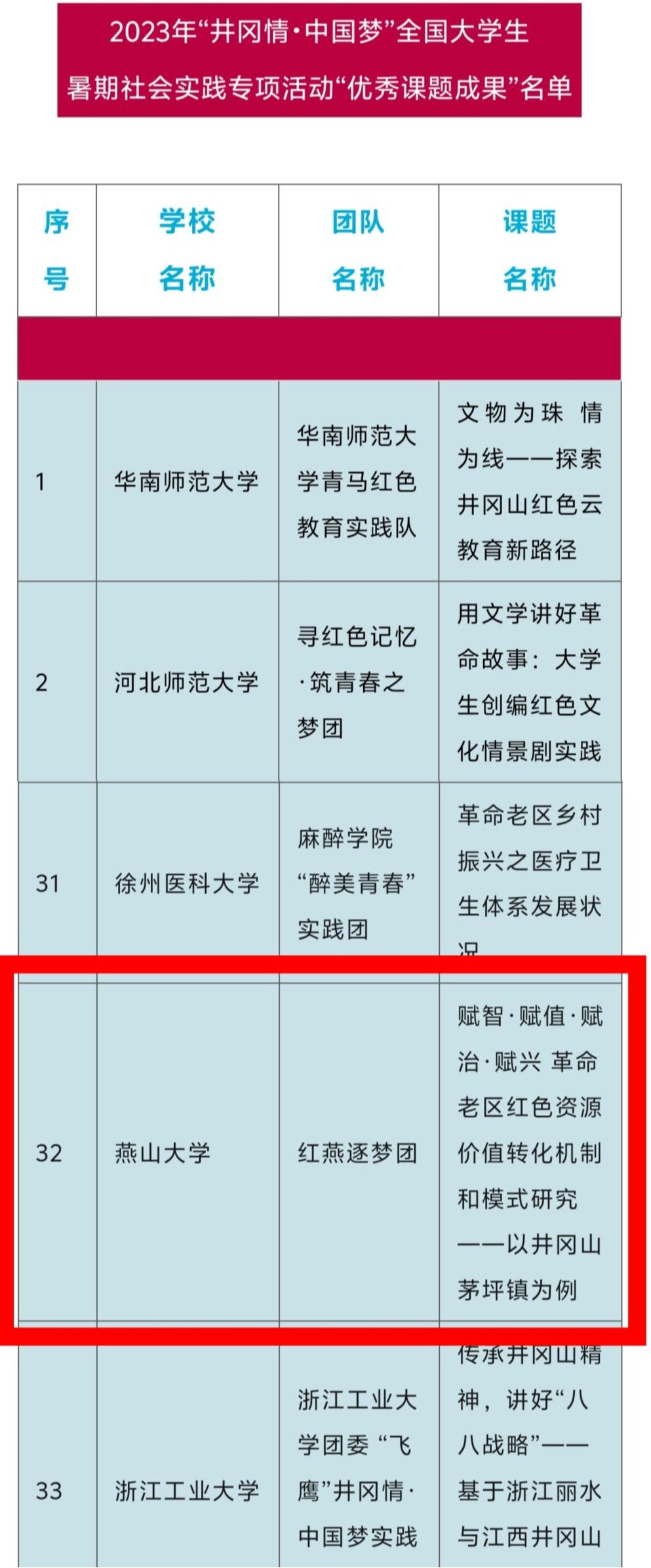 【新闻中心讯】近日,团中央青年发展部、全国青少年井冈山革命传统教育基地管理中心正式公布了2023年“井冈情•中国梦”全国大学生暑期社会实践专项活动评选结果。燕山大学外国语学院“红燕逐梦团”所作课题在全国共计104支队伍中脱颖而出,荣获“优秀课题”荣誉称号。