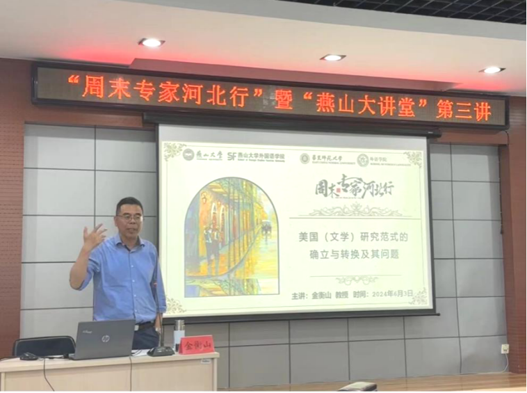 【新闻中心讯】6月3日外国语学院“周末专家河北行”暨 “燕山大讲堂”第三讲在报告厅举行。此次讲座邀请了国内知名美国(文学)研究专家华东师范大学博士研究生导师金衡山教授,深入剖析“美国(文学)研究范式的确立与转换及其问题”。金衡山教授现任华东师范大学美国研究中心副主任,兼任全国美国文学研究会常务理事,中国英语教学研究会常务理事,上海美国学会常务理事,上海外国文学研究会常务理事,主要研究美国文学、美国文化和美国研究。讲座由副院长付继林主持,学院硕士生导师和研究生参加了讲座。