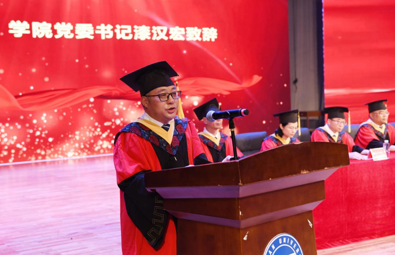 “你们与困难磨砺正面交锋,体验过收获知识的喜悦、战胜过实验失败的沮丧”“你们所留下的青春声音、美好瞬间和奋进故事,我们全都珍藏心间……”漆汉宏深情回顾了同学们的成长经历,代表学院向各位毕业生表示热烈祝贺和美好祝愿,向辛勤耕耘、默默奉献的老师,向关心支持学院工作的家长致以衷心感谢。漆汉宏寄语毕业生:希望大家听党话、跟党走,高扬理想风帆,在向下扎根中坚守初心、磨砺意志,在向上生长中突破自我、追求卓越,用赤诚之心铸就强国梦想。希望大家能吃苦、肯奋斗,锤炼过硬本领,在摸爬滚打中增长才干,在层层历练中积累经验,以足够的本领担负起时代赋予的重任。希望大家敢担当、善作为,贡献青春力量,向内汲取知识养分、向外探索未知边界,用实际行动回答好“强国复兴、青年何为”的时代命题。