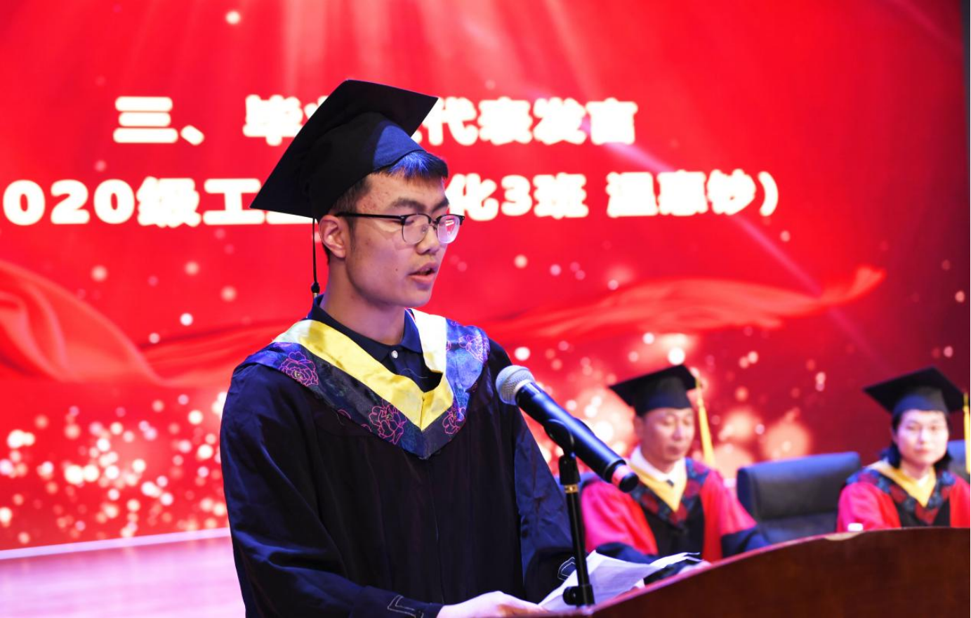 毕业生代表、自动化专业学生温惠钞分享了大学生活的难忘瞬间,向母校、老师和同学表达真挚的感谢与不舍,并向母校发出在社会广阔天地中展现青春作为、彰显青春风采、贡献青春力量的庄严承诺。