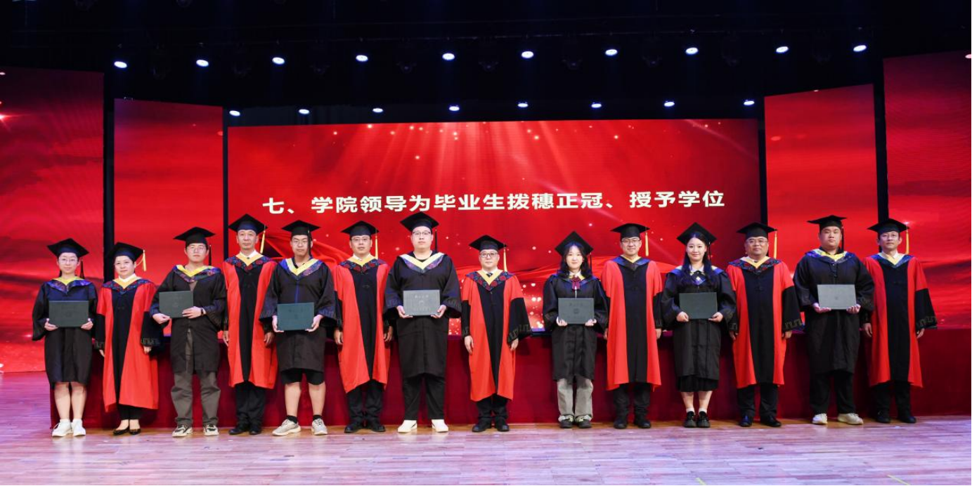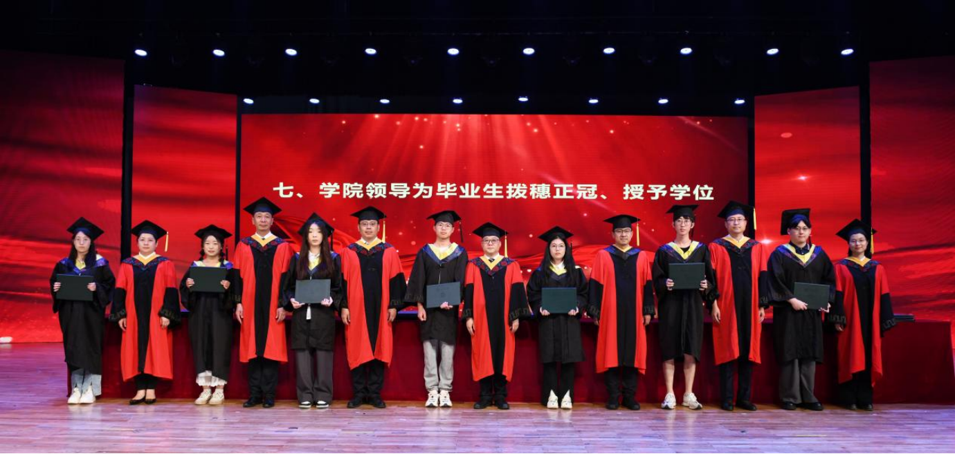 在学位授予环节,学院领导、各系负责人为全体毕业生逐一拨穗正冠,颁发学位证书并合影留念。