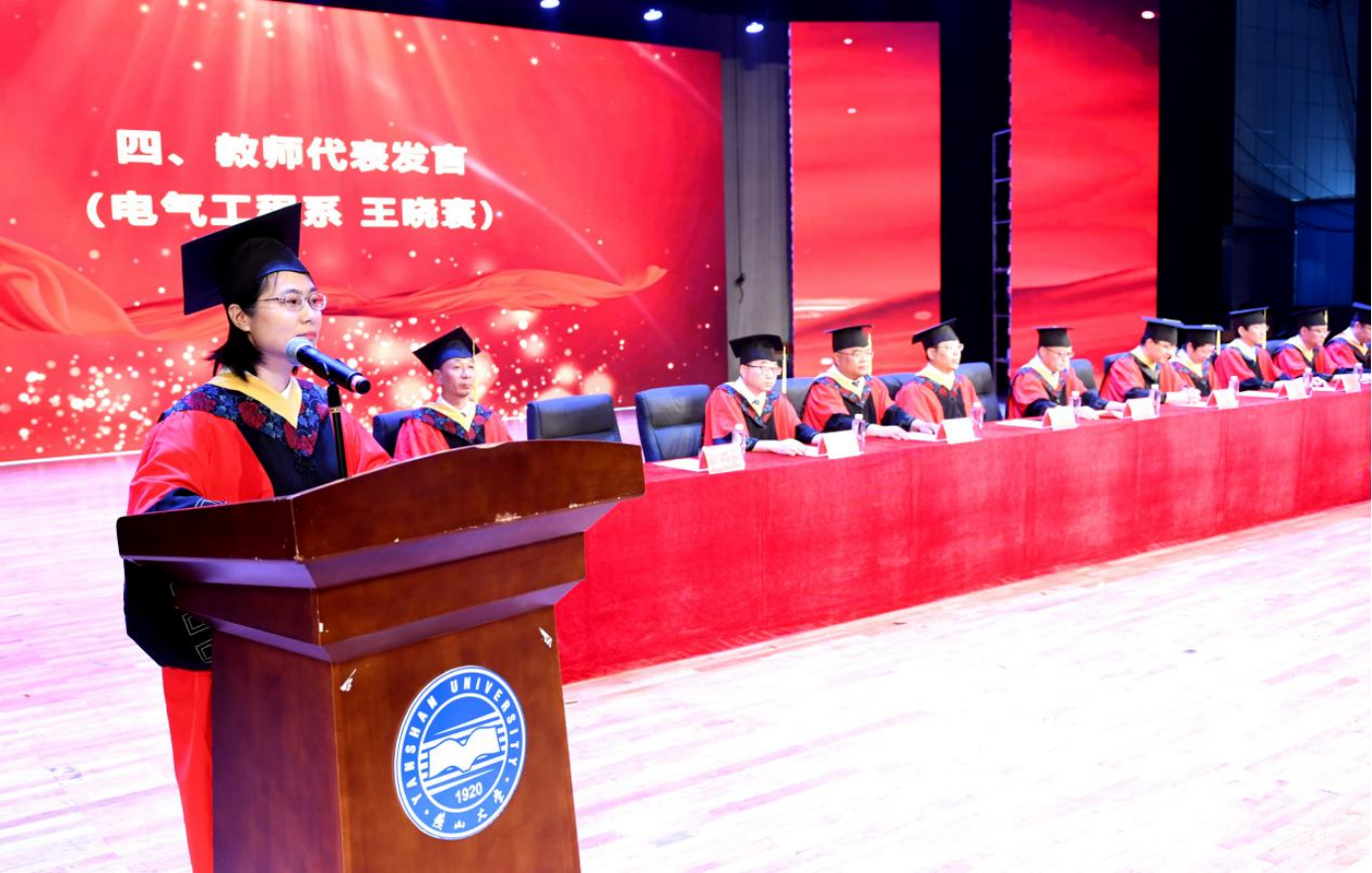 教师代表、电气工程系王晓寰教授深情表达了对毕业生的祝福和期许,鼓励同学们向阳而生、逐光而行,心怀温暖与美好,终会到达理想。