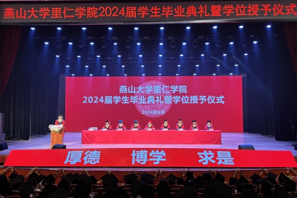 【新闻中心讯】6月13日下午,燕山大学里仁学院2024届学生毕业典礼暨学位授予仪式在东校区大学生活动中心隆重举行。燕山大学校长赵丁选以及里仁学院领导班子成员出席了典礼。典礼由里仁学院党委书记张向前主持,活动在学院团委官方视频号“里仁青年”进行了全程直播。