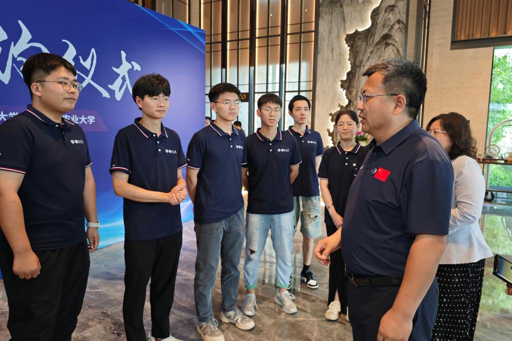 活动中,校地双方签订了大学生社会实践基地合约并举行揭牌仪式。仪式后,蔡星周一行与我校精心选派的11名硕博研究生亲切交谈,蔡星周一一询问大家的工作地点和服务内容,他希望同学们谦虚有礼、勤勉务实,出色完成实践任务,让“服务雄安新区”成为人生中闪亮的地标和难忘的回忆。
