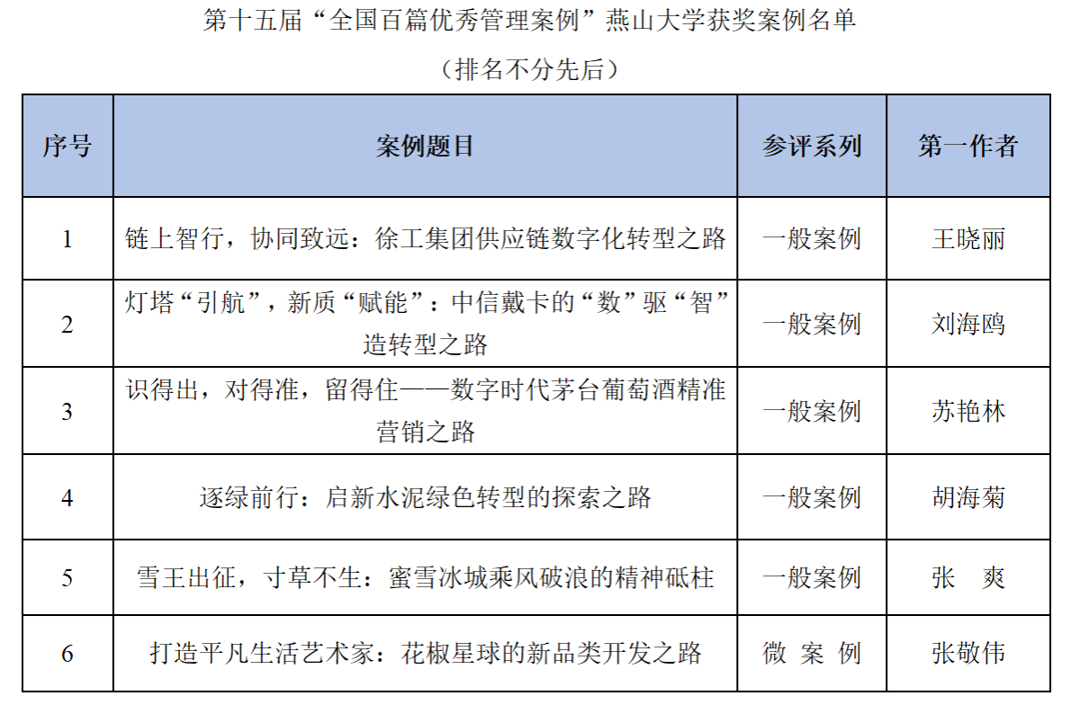 【新闻中心讯】9月9日,在全国工商管理专业学位研究生教育指导委员会支持和指导下,中国管理案例共享中心公布了第十五届“全国百篇优秀管理案例”评审结果。历经层层选拔,我校6篇案例从179所院校的1512篇投稿中脱颖而出,成功获评第十五届“全国百篇优秀管理案例”,整体获奖率达42.9%,获奖数量全国排名第八,京津冀区域排名第一。案例获奖数量创历史新高,标志着我校管理案例研究与开发工作取得了重大突破。