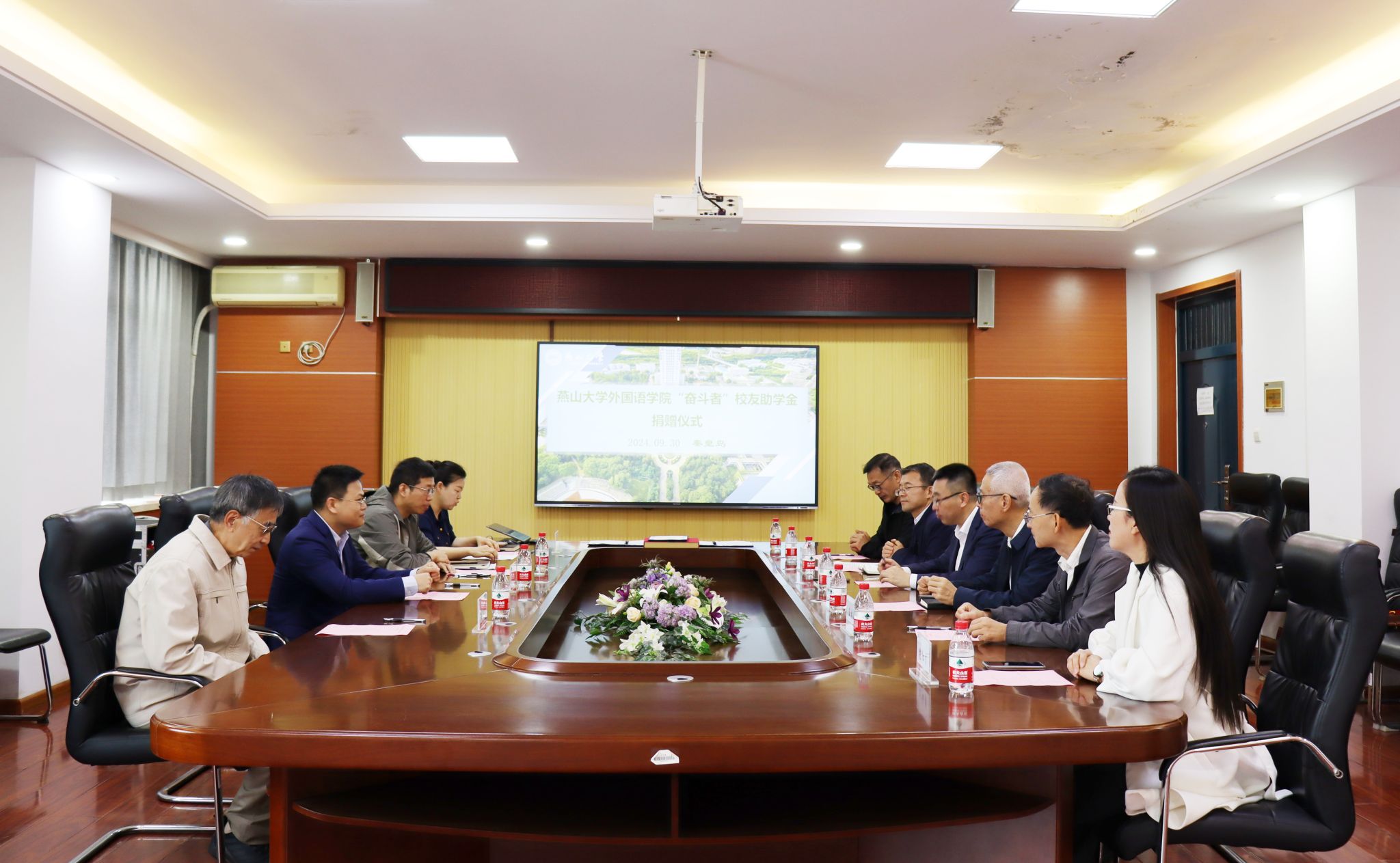 【新闻中心讯】近日,燕山大学教育基金会与2000级商务英语专业校友、深圳市爱丽客精细化工有限公司总经理彭俊强“奋斗者”校友助学金捐赠仪式在人文馆417举行。燕山大学党委常委、副校长王利民、燕山大学教育基金会理事长、校友办主任、里仁学院党委书记张向前、外国语学院党委书记屈晓阳、院长王林海、副院长付继林,燕山大学校友办副主任、基金管理办公室主任纪红月、外国语学院英语系副主任侯羽、外国语学院退休教师代表王牧群出席仪式。捐赠仪式由外国语学院党委副书记夏亮亮主持。