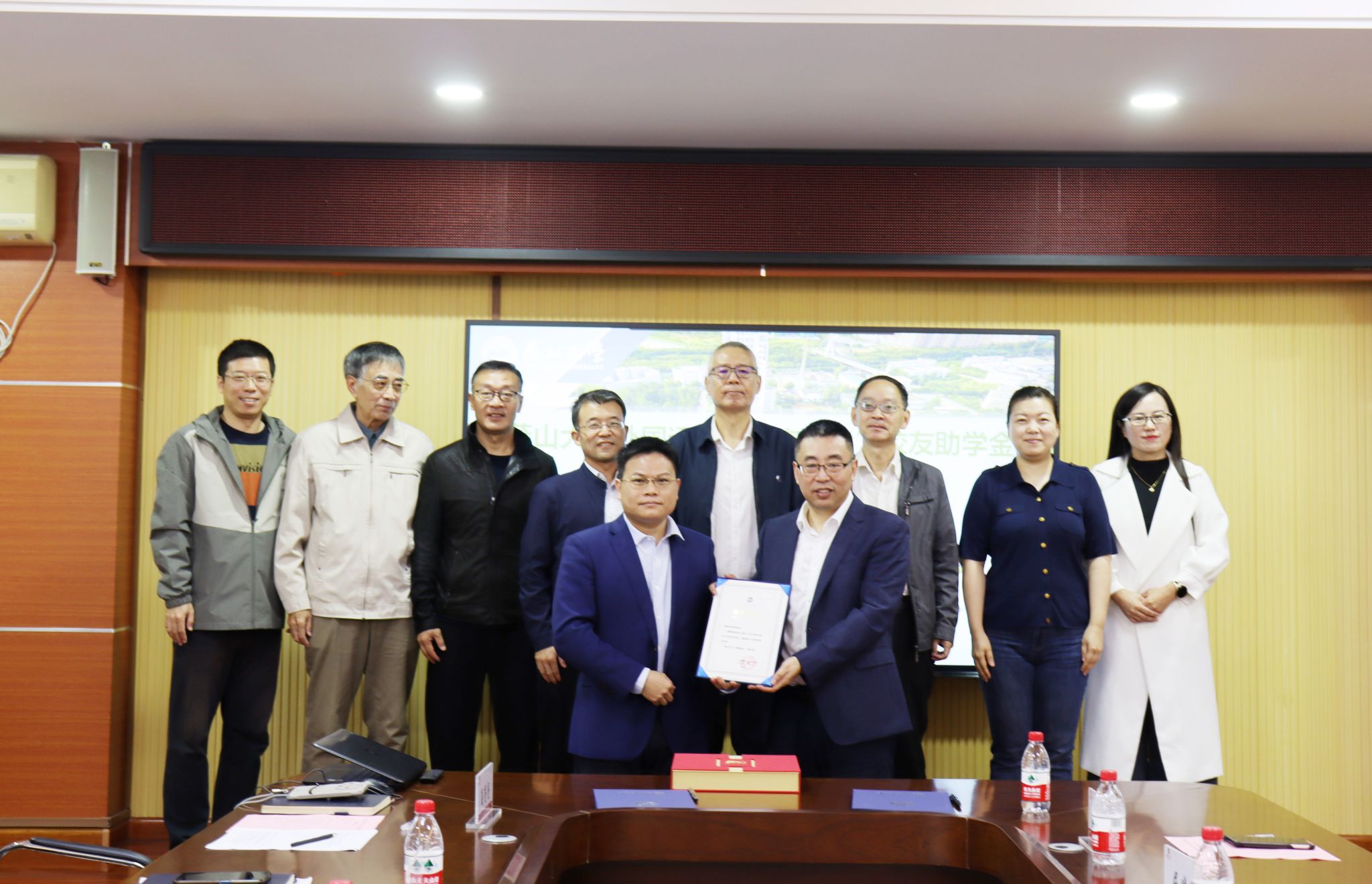 双方在与会人员见证下,在捐赠协议上签字,完成这一重要的历史时刻,随后王利民为彭俊强校友颁发捐赠纪念品。