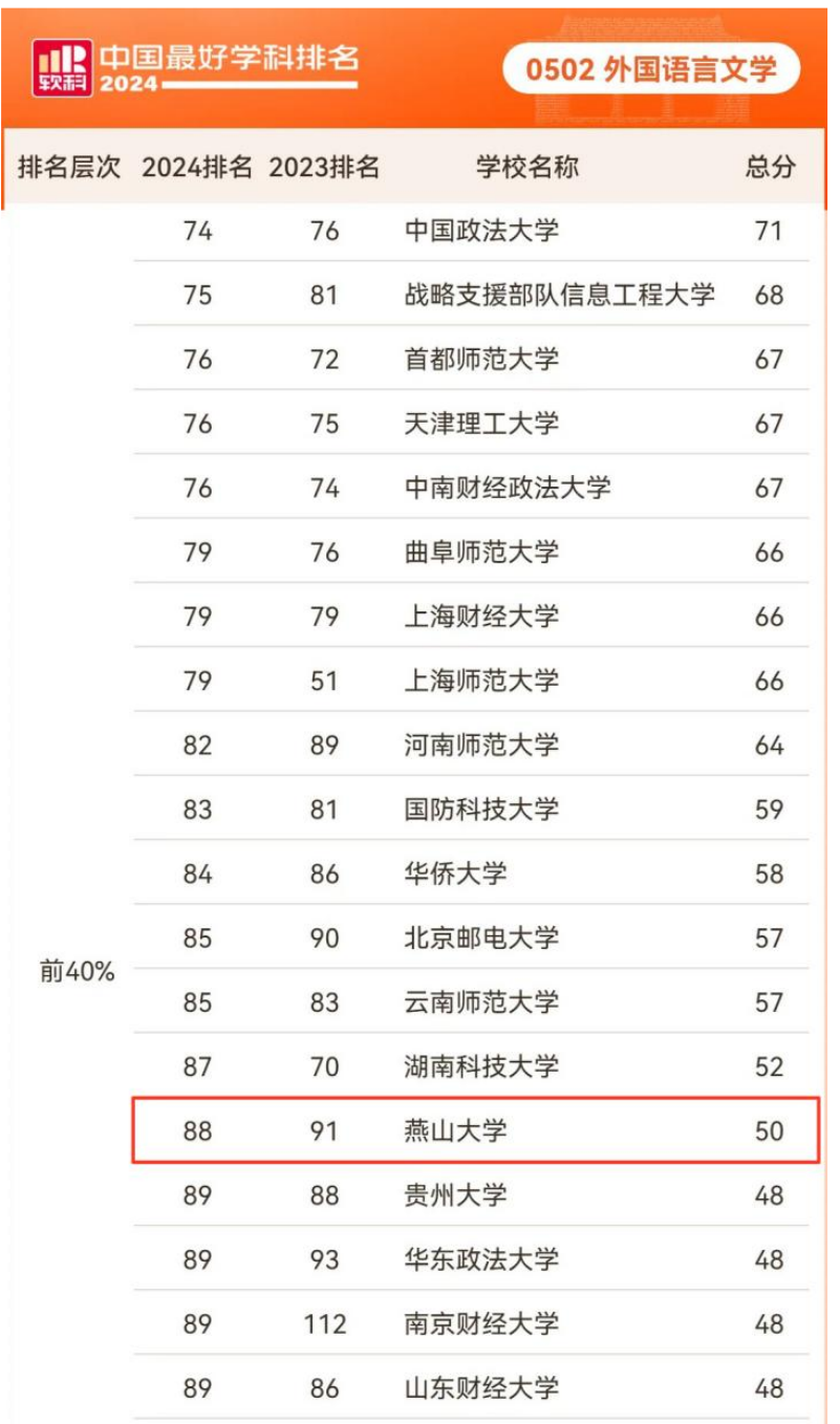 【新闻中心讯】10月15日,高等教育评价专业机构软科正式发布“2024软科中国最好学科排名”。外国语言文学学科共120个高校上榜,燕山大学外国语言文学学科连续3年跻身“软科排名”全国前40%,与2023年相比,前进3名,位列88,居河北省第一位,外国语言文学学科建设取得新突破。