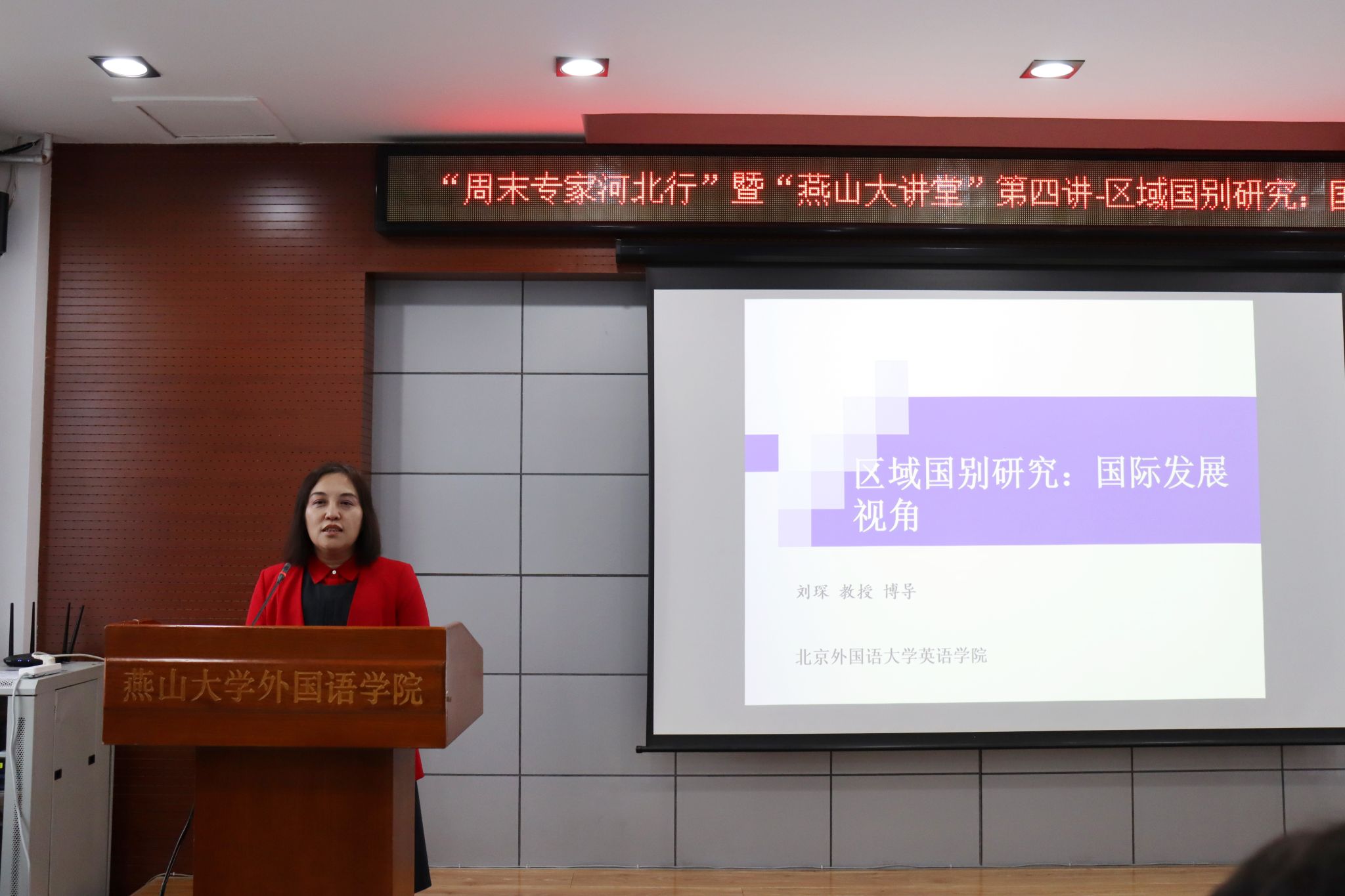 【新闻中心讯】10月18日,外国语学院成功举办“周末专家河北行”系列活动暨“燕山大讲堂”第四讲。本次讲座邀请北京外国语大学教授、博士生导师刘琛主讲,她就“区域国别研究:国际发展视角”进行了深刻剖析。刘琛是教育部区域国别研究基地北京外国语大学加拿大研究中心主任,兼任联合国高专办独立专家;G20“教育与数字转型”和“文化保护融合与新生活方式”两个工作组专家。同时刘琛也是加拿大第一民族委员会(First Nations,Canada)中国研究代表、哈佛大学女性联合会主席团主席(首位入选华人)并入选北京市“四个一批人才”、北京市“宣传文化系统高层次人才”。讲座由副院长付继林主持,学院百余名硕士研究生和部分导师听取了报告。
