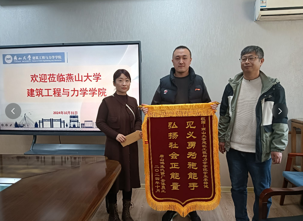 【新闻中心讯】10月31日,建筑工程与力学学院迎来了一批特殊的客人,他们手持“见义勇为施能手 弘扬社会正能量”的锦旗和感谢信,来寻找那个危急关头扑灭火情、避免唐山鸿业汽修厂遭受巨大财产损失的见义勇为好青年——学院2022级土木工程专业学位硕士研究生学生李梓健。一面锦旗、一封感谢信,道出了一个暖心的故事。