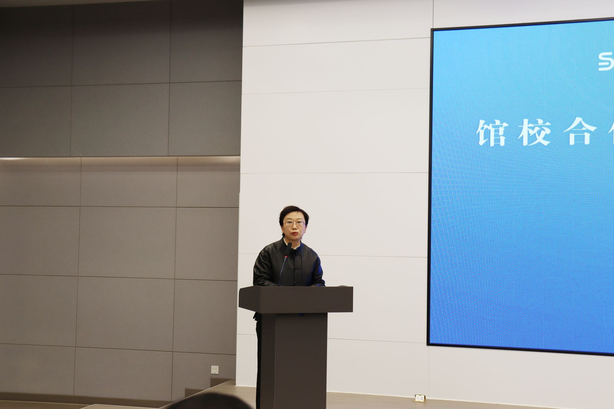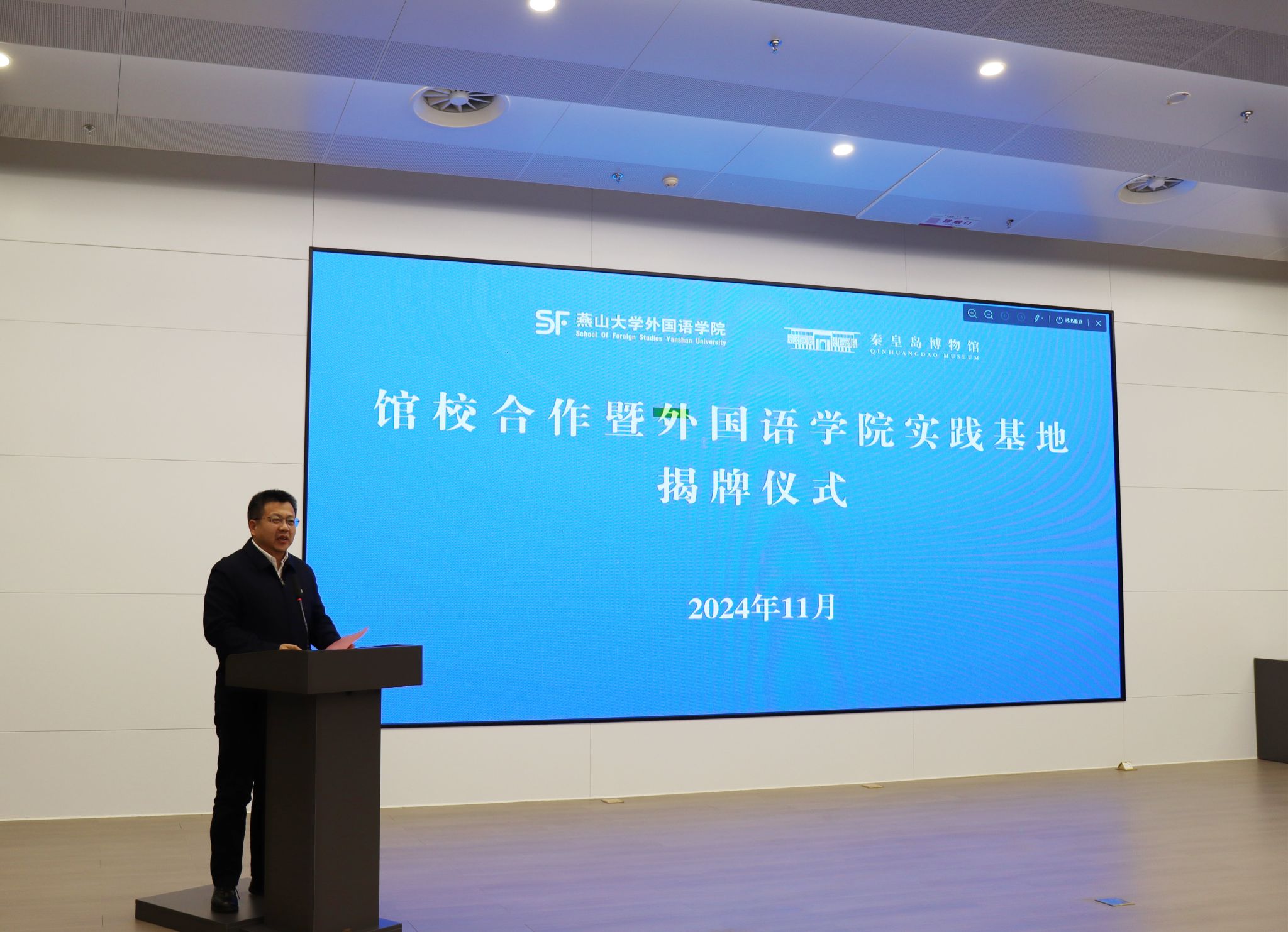 付红在致辞中对秦皇岛博物馆做了详细的介绍。她表示,博物馆是城市文化的重要载体,是城市文化“会客厅”。秦皇岛博物馆承载着丰富的地域文化和历史底蕴,是传承和弘扬中华优秀传统文化的重要阵地,它不仅展示了秦皇岛地区悠久的历史和灿烂的文化,更是我们了解和传承中华优秀传统文化的重要窗口。此次,秦皇岛博物馆与燕山大学外国语学院共建实践基地,期望能够实现资源整合与优势互补,加强联系,进行深度合作与交流,用不同语言传播秦皇岛故事,打造更有国际影响力的秦皇岛文化品牌,实现文博事业创新性发展。同时也为师生提供一个展现业务能力的窗口,更好促进高层次、高水平的复合型创新性人才培养。希望双方能够珍惜这次合作机会,加强沟通交流,深化合作内容,创新合作方式,共同推动校馆共建合作向更高水平、更深层次、更广领域发展。