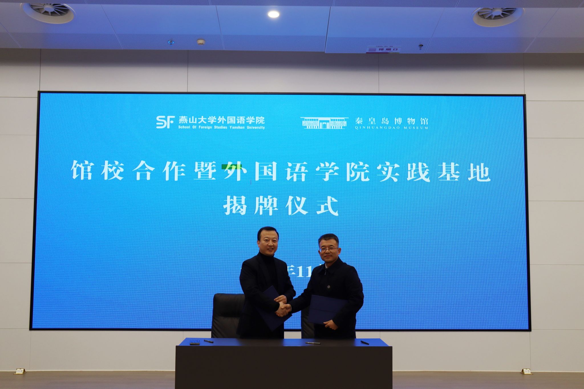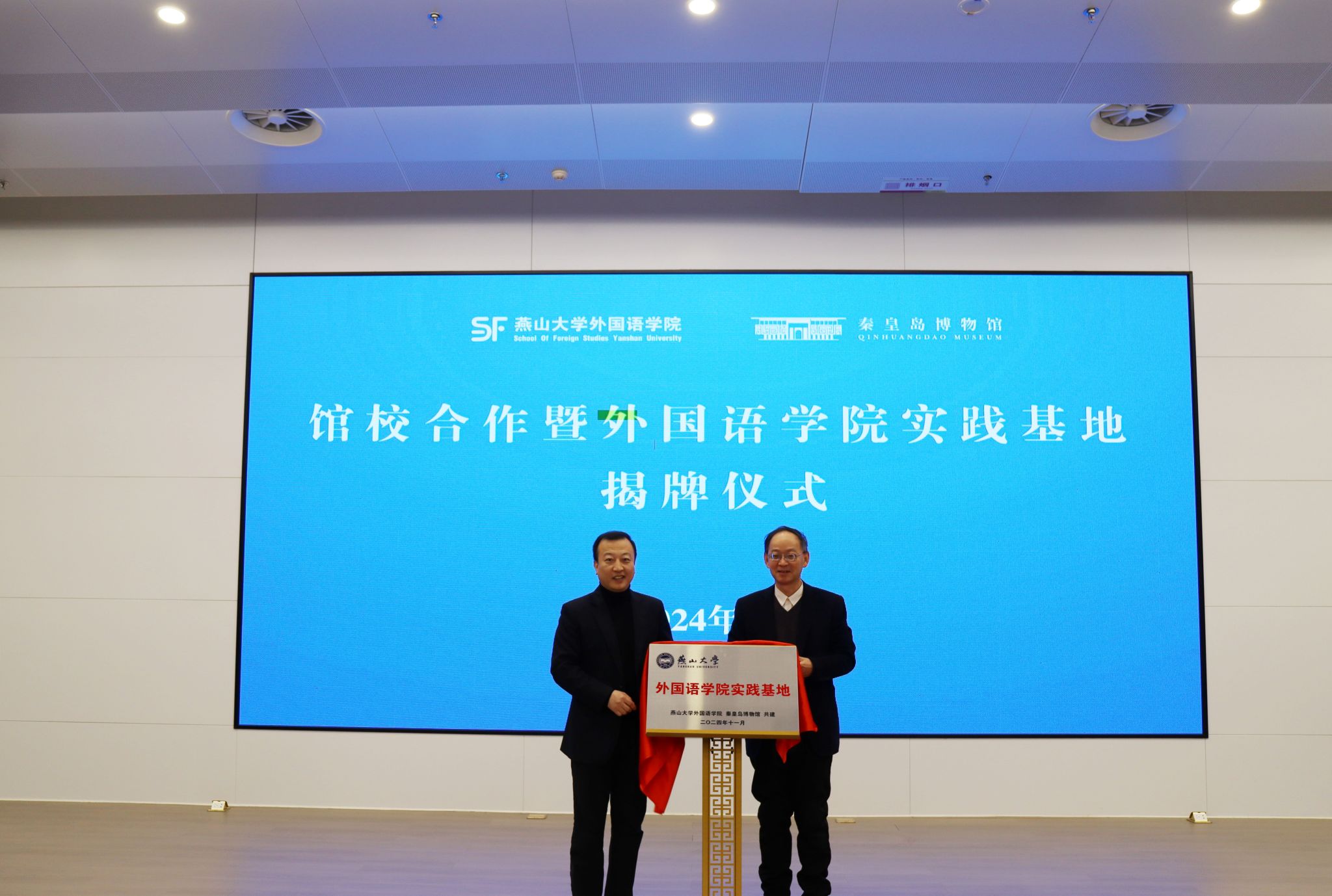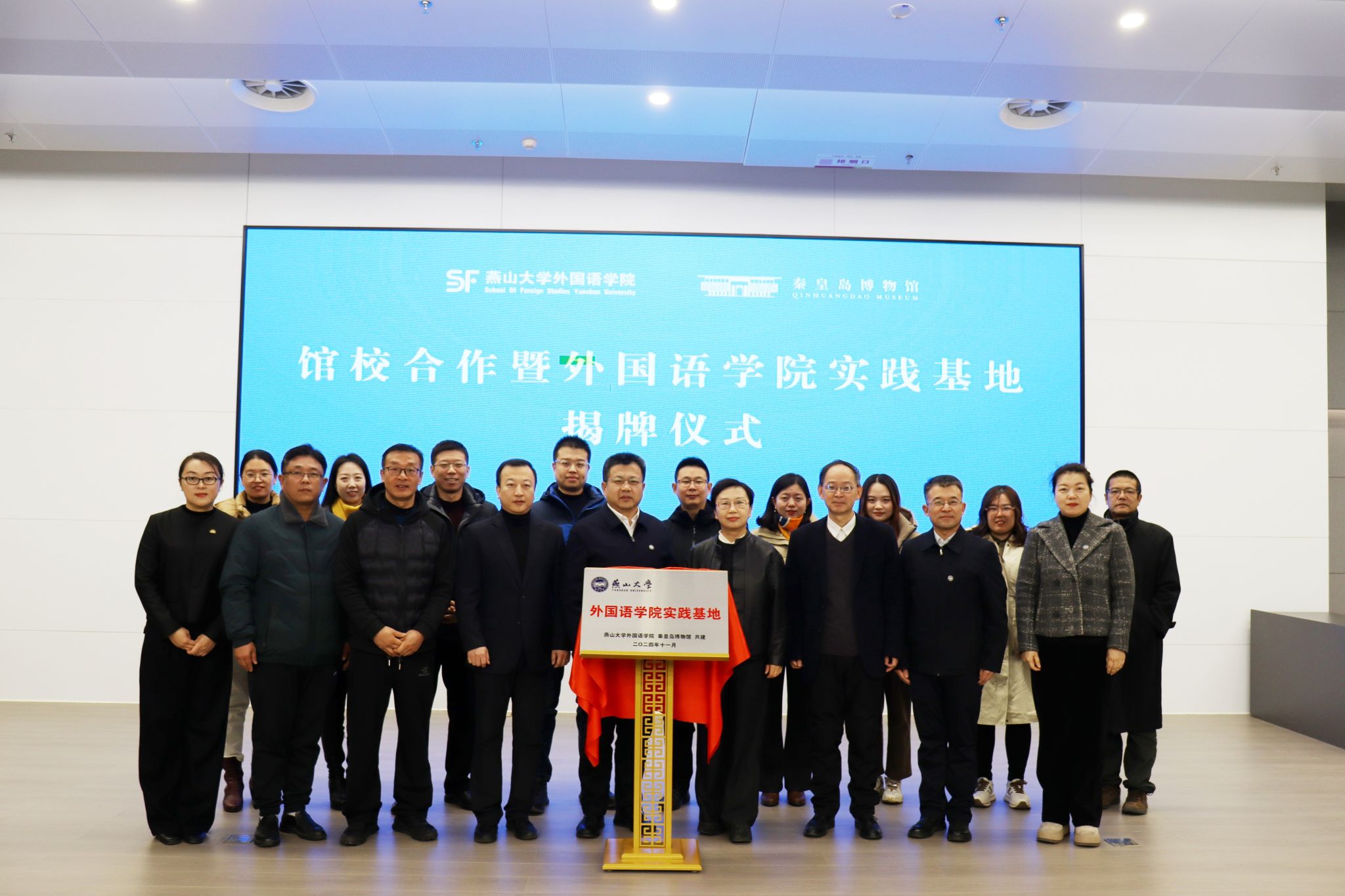 【新闻中心讯】为进一步深化教育教学改革和优化人才培养模式,丰富高校师生教育教学实践活动,发挥社会文化育人资源作用,建立馆校共建合作育人机制。11月27日上午,燕山大学外国语学院与秦皇岛博物馆共建协议签订暨实践基地揭牌仪式在秦皇岛博物馆乐竞体育在线报告厅举行。燕山大学党委常委、副校长蔡星周,秦皇岛旅游和文化广电局二级调研员付红,秦皇岛博物馆馆长郭绘宇,外国语学院党委书记屈晓阳,院长王林海,副院长付继林,副院长赵志刚,学院党委副书记夏亮亮及馆员、教师、学生代表出席仪式,会议由秦皇岛博物馆副馆长孙昕主持。