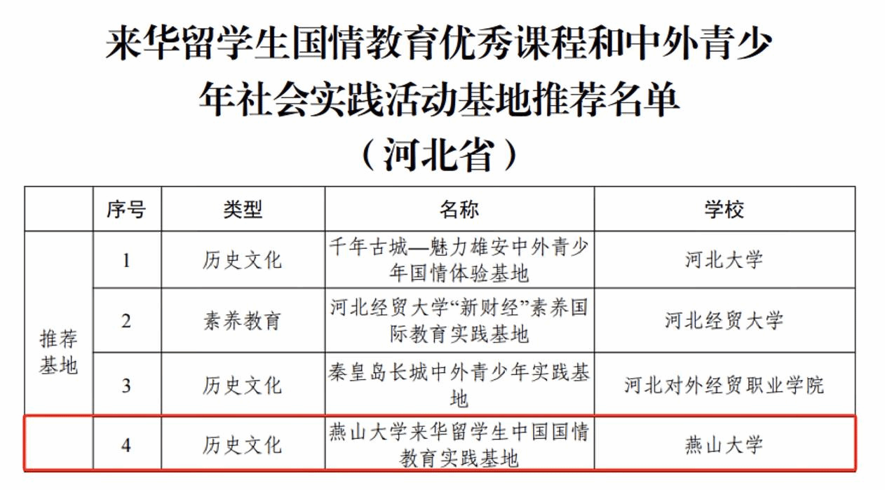 【新闻中心讯】近日,受教育部国际合作与交流司委托,中国教育国际交流协会面向全国高校开展了首批来华留学生国情教育优秀课程和中外青少年社会实践活动基地征集工作。经专家研究和审定,最终共推荐了111 门课程和 115 个基地。其中,河北省4个基地获推,“燕山大学来华留学生中国国情教育实践基地”位列其中。