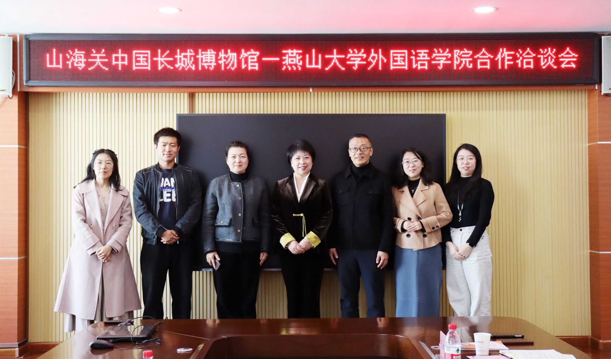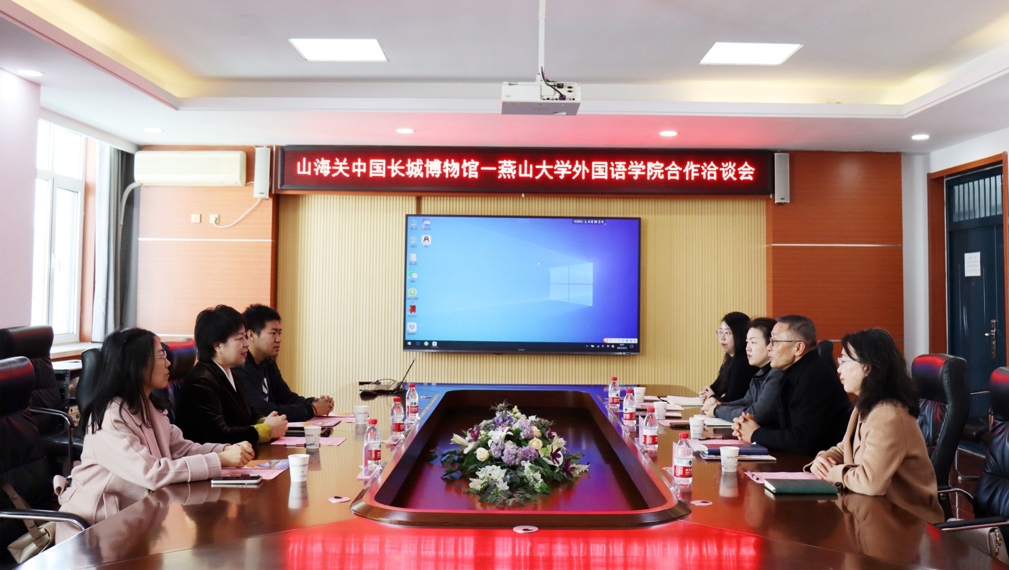 【新闻中心讯】为深入挖掘长城文化内涵,加强馆校交流合作,共同推动长城文化的传承与发展,3月21日上午,山海关中国长城博物馆副馆长郭颖、社会教育部姚莹莹、令火青年(河北)教育科技有限公司董事长单文博一行来到燕山大学外国语学院,就馆校合作进行了战略合作会谈。外国语学院副院长付继林、院党委副书记夏亮亮、手语语言及应用研究中心主任刘鸿宇、辅导员宋婉玉参加了座谈,会谈由副院长付继林主持。