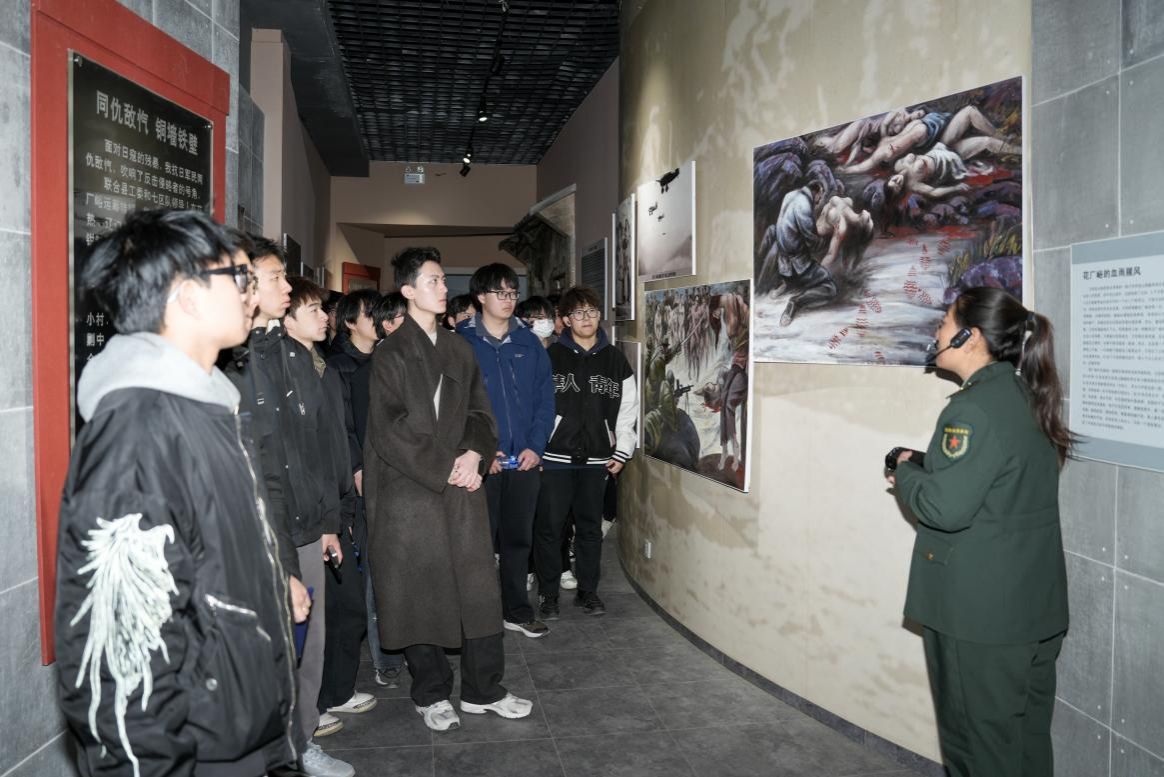 缅怀仪式结束后,同学们来到花场峪抗战纪念馆,在讲解员的带领下,感受英烈们的热血与豪情。一件件饱经岁月沧桑的文物、一幅幅生动详实的历史图片、一段段震撼人心的英雄事迹,诉说着先烈们的英勇,散发着历史的温度,在场师生无不动容。