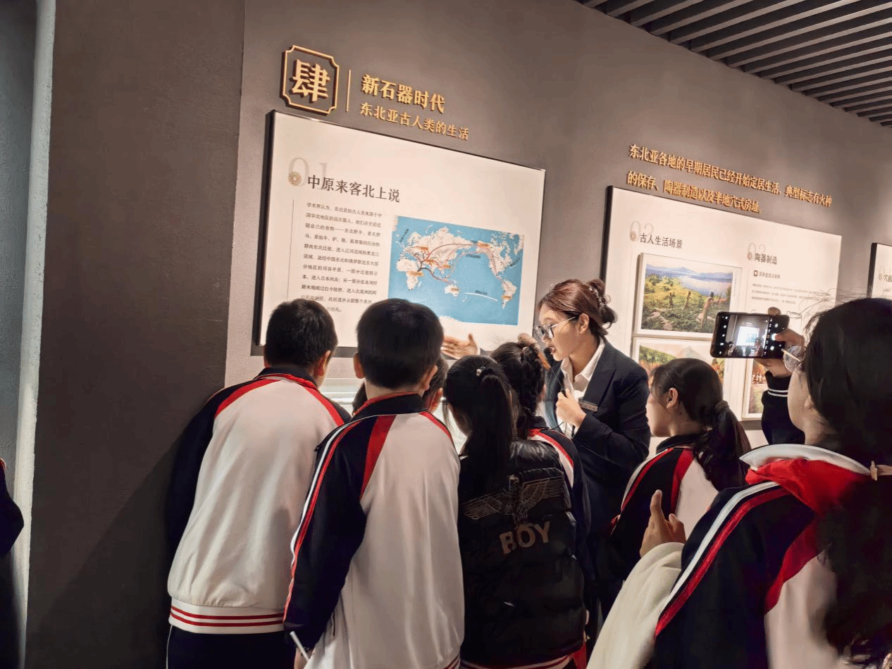 随后,小朋友在志愿者的带领下来到燕山大学东北亚古丝路文明博物馆,讲解员带领小朋友有序参观了古生物化石陈列厅、旧石器时代陈列厅、新石器时代陈列厅、东北亚古丝路沿线诸民族各类文物陈列、近现代文物陈列等展厅,生动有趣的讲解激起孩子们对文物的强烈兴趣,切身感受到东北亚古丝路文明的丰富内涵和独特魅力。