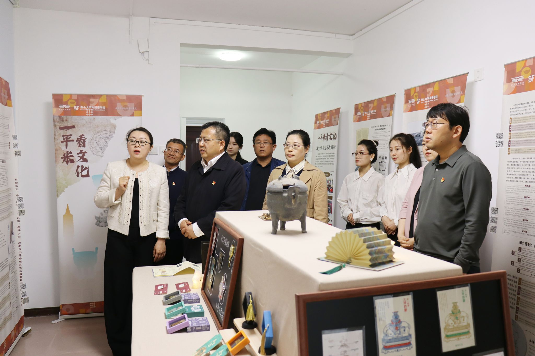 仪式后,与会代表参观“一平米 看文化”学生社区微型博物馆展陈。此次展陈以秦皇岛博物馆十大重点文物为主,外国语学院师生提供英、日、俄、德、法五国语言的翻译服务,“即扫即听”带来便捷体验,使参观者既能欣赏文物外在美,又能透过多语种解读,探寻文物背后的文化基因与历史密码。