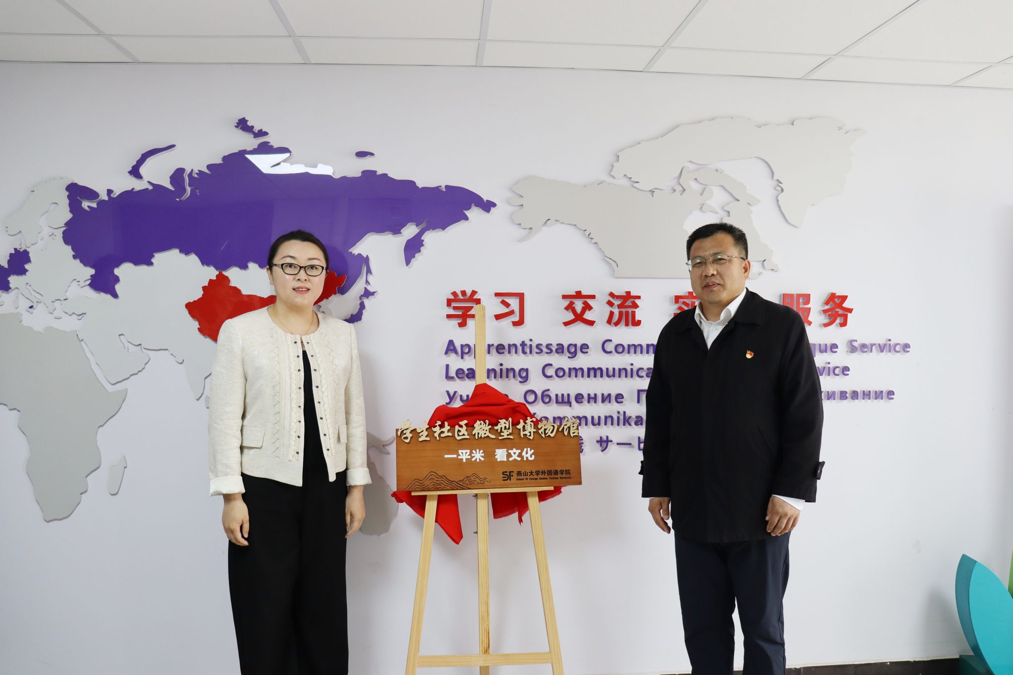 【新闻中心讯】在“5.18国际博物馆日”来临之际,为充分发挥社会文化育人资源,探索传统文化与外语学科融合新路径,5月16日,“一平米 看文化”学生社区微型博物馆在燕山大学外国语学院“寓见文化”学生社区揭牌。秦皇岛博物馆副馆长孙昕、燕山大学党委副书记蔡星周、学生工作处处长薛传佳、副处长王银思、外国语学院党委书记屈晓阳、副院长赵志刚出席。仪式由外国语学院党委副书记夏亮亮主持。