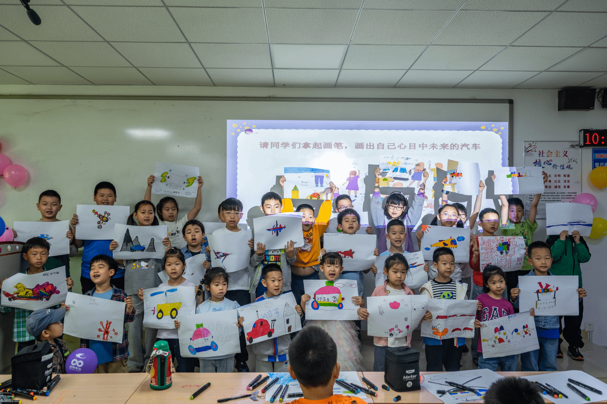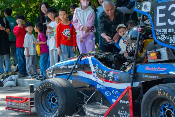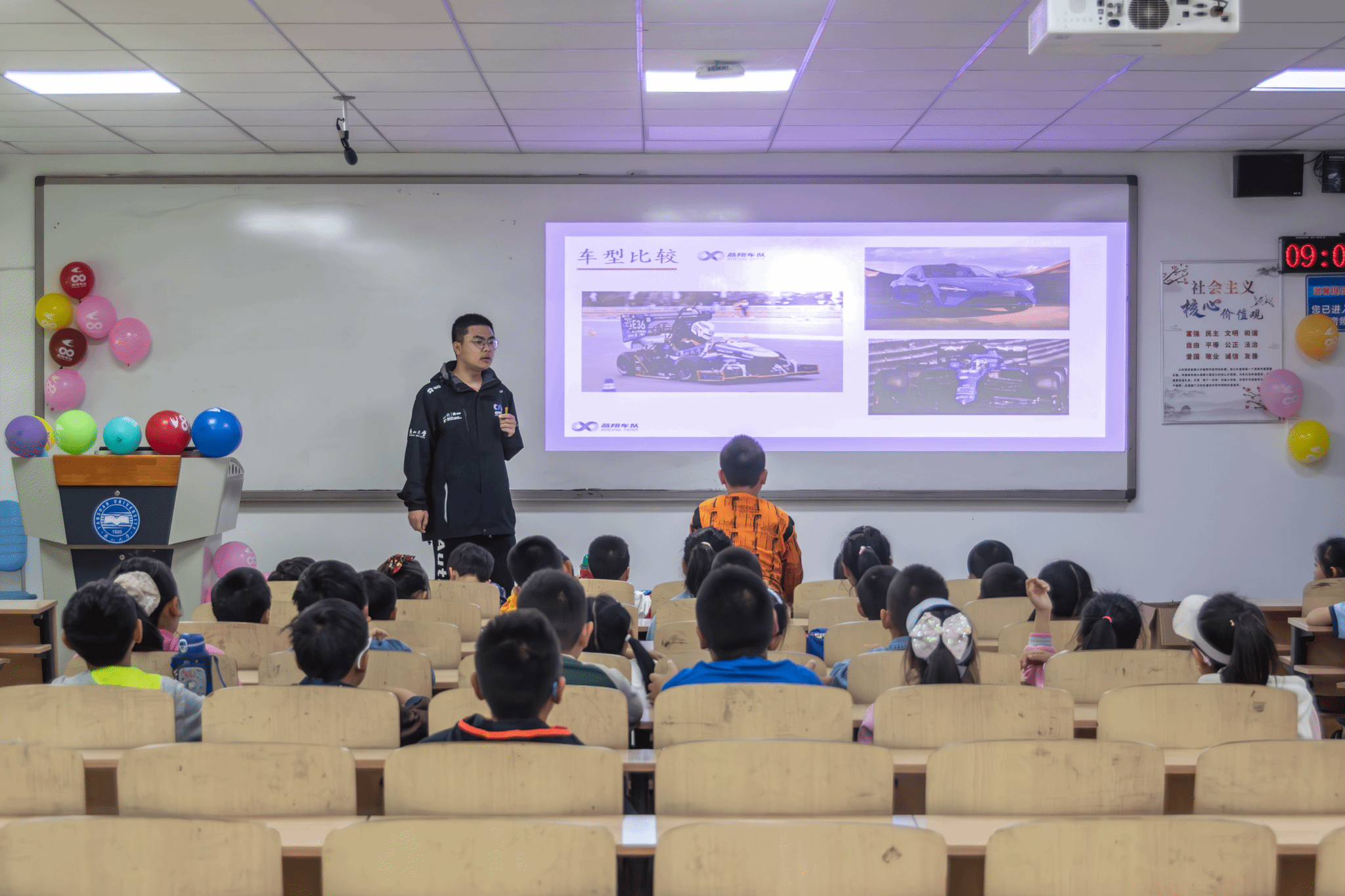 活动伊始,燕翔车队科普小课堂在东校区第四教学楼114教室拉开序幕。课堂以“赛车工程师”为主题,由燕翔车队队长担当主讲人,以生动风趣的语言和图文并茂的演示,向孩子们揭秘方程式赛车的设计与竞速奥秘。课堂互动环节,孩子们充分发挥想象力和创造力,用多彩画笔描绘出自己心目中赛车的模样,并将作品放在胸前与赛车合影留念,记录下这难忘的时刻。之后在东校区第四教学楼门前花坛处,小朋友们还近距离观看了车手驾驶YX-15线下跑车,完成直线加速等赛车动态展示,亲身体验方程式赛车的速度与激情。