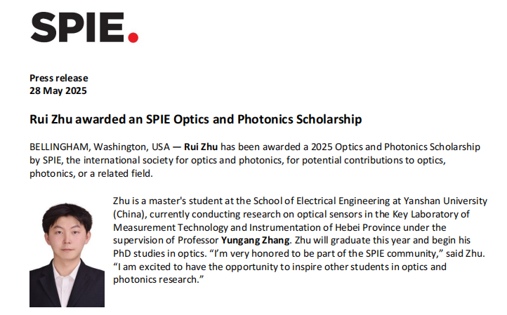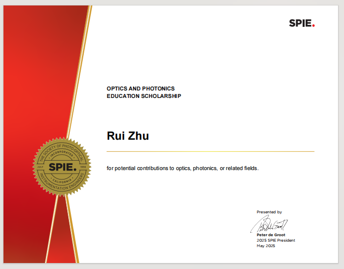 【新闻中心讯】近日,国际光学工程学会(International Society for Optics and Photonics, SPIE)正式公布了2025年度光学与光子学教育奖学金(SPIE Optics & Photonics Education Scholarship)评选结果,我院张云刚教授团队硕士研究生朱瑞荣获该奖项。SPIE奖学金评选委员会主席Brian Primeau教授向所有获奖者表示祝贺,称赞了他们在光学和光子学研究中取得的成绩,并表达了对于他们在学界做出长期贡献的期待。