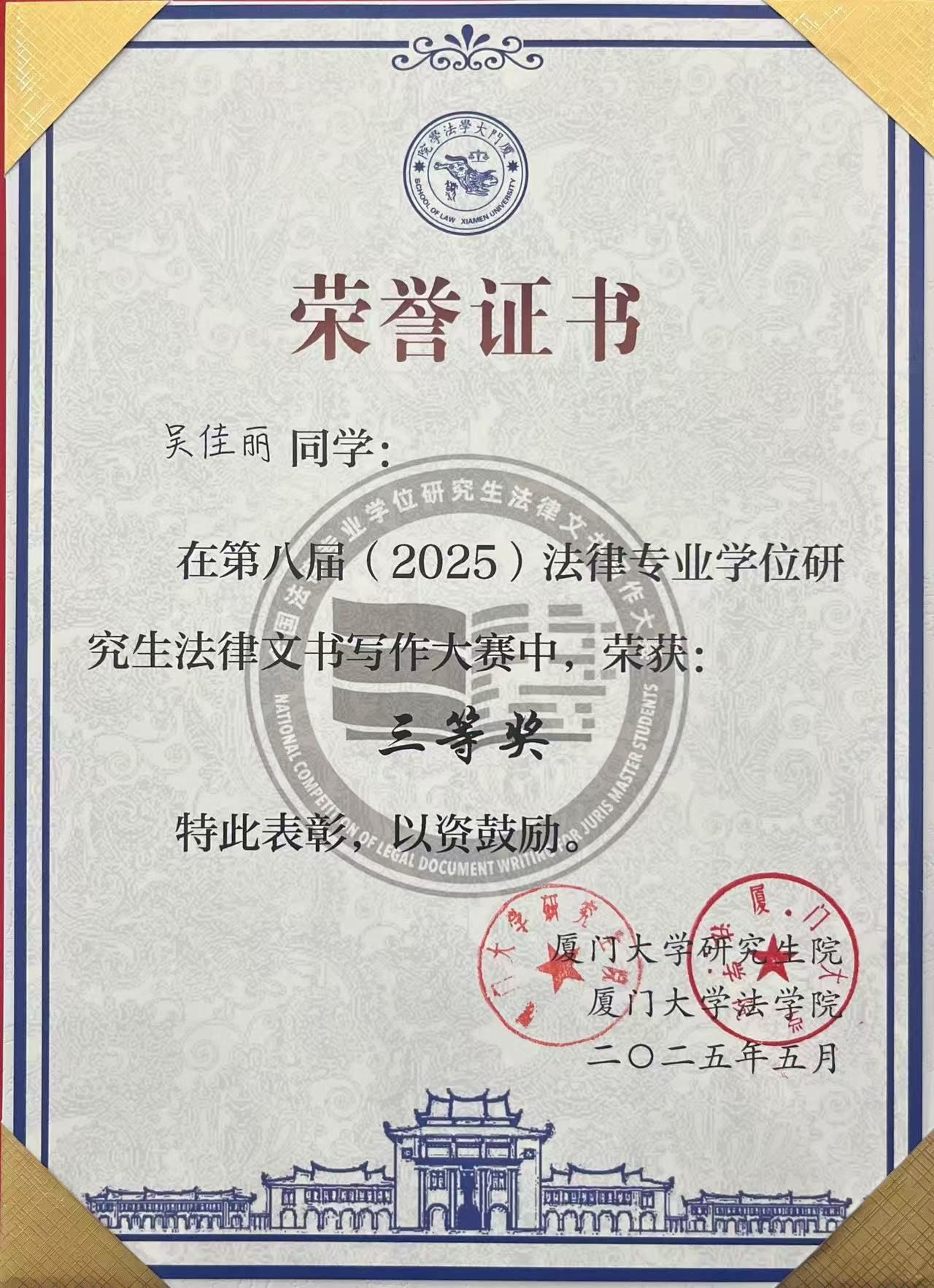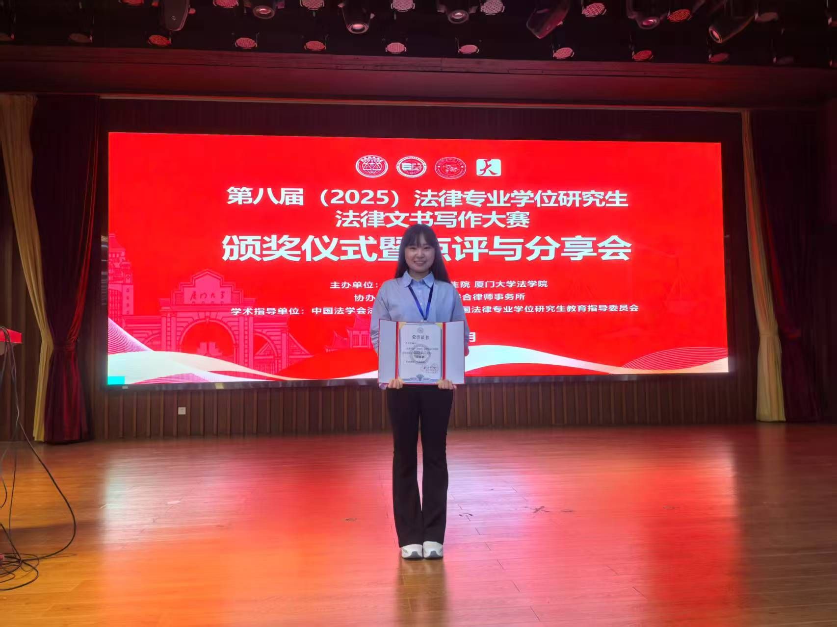【新闻中心讯】2025年5月,由厦门大学研究生院、厦门大学法学院联合主办,福建天衡联合律师事务所协办,中国法学会法学教育研究会、全国法律专业学位研究生教育指导委员会作为乐竞体育在线指导单位的全国第八届(2025)法律专业学位研究生法律文书写作大赛圆满落幕。文法学院(公共管理学院)法学专业研究生吴佳丽同学经过初赛、复赛和决赛,取得三等奖的优异成绩。最高人民检察院、司法部有关领导及厦门大学法学院院长陈鹏等领导、专家在颁奖典礼上发言并为获奖选手颁奖。