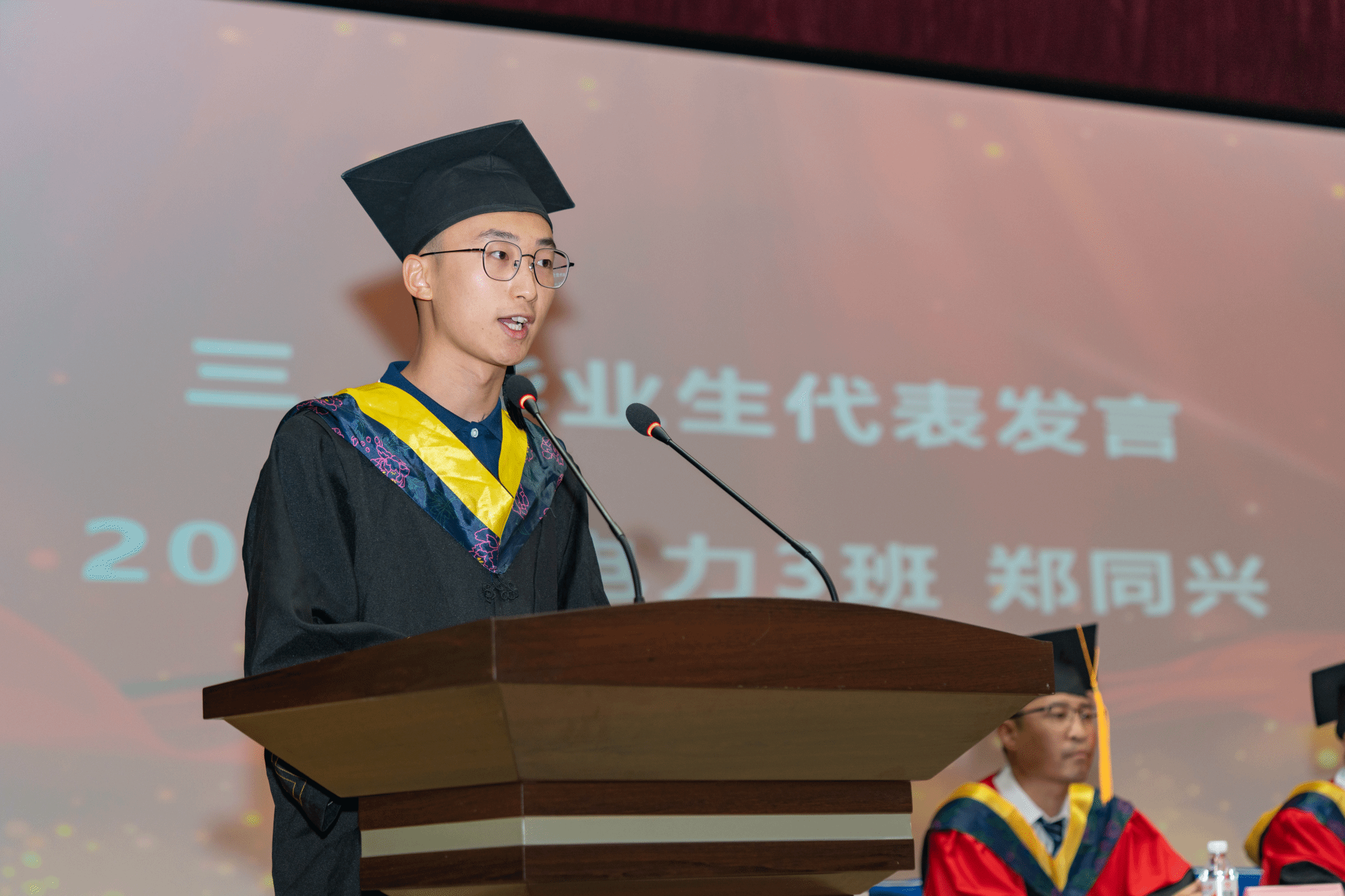 毕业生代表、电力系统及其自动化专业学生郑同兴发言,他回忆了大学四年的点滴,言语间满是对母校、老师和同学的感激与不舍。