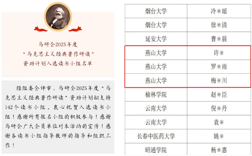 马克思主义学院始终高度重视学生对经典文献的阅读,并以“五峰书堂”经典共读会和“红色旋律”系列活动为基础,帮助学生培养阅读兴趣,解决经典文献阅读中的困难,成为学生与经典文献之间连接的重要桥梁。此次我院3个读书小组成功入选马研会“马克思主义经典著作研读”资助计划,体现了我院在师生经典著作研读中逐渐走深走实。(编辑 王艳)