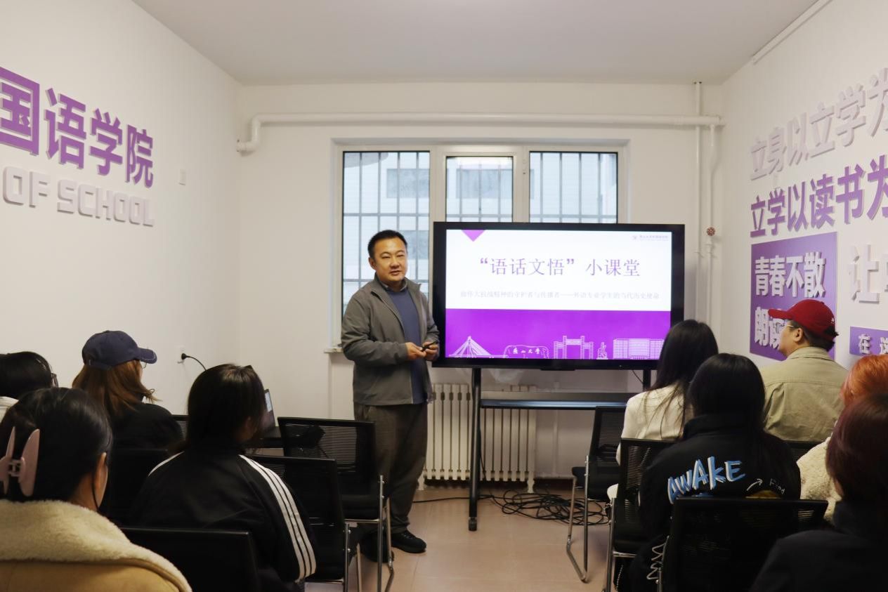 专业分享课靶向赋能,以外语专长践行青年使命担当。日语系教师党支部书记刘洪岩以“做伟大抗战精神的守护者与传播者——外语专业学生的当代历史使命”为题引导学生梳理外文史料中蕴含的抗战精神,重点分析中国共产党在抗战中的中流砥柱作用。强调要让历史和文物说话,用史实发言,外语不仅是语言工具,更是国家文化软实力传播的桥梁,激励学生把抗战精神转化为精确的国际语言,向世界传递中国历史观与和平理念,奉献青春力量。