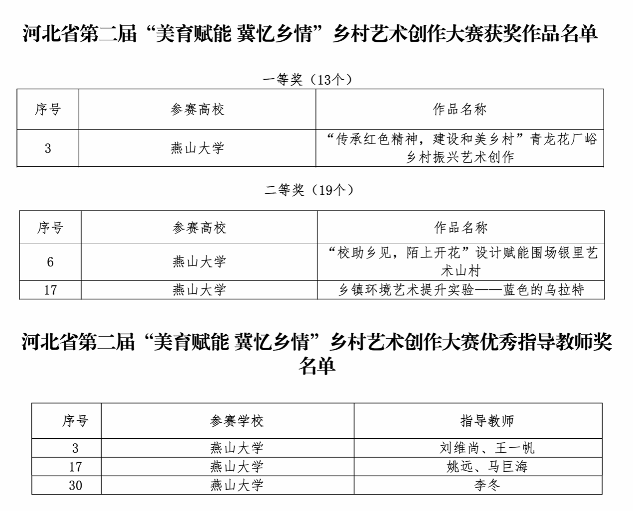 【新闻中心讯】近日,从河北省第二届“美育赋能 冀忆乡情”乡村艺术创作大赛传来喜讯,燕山大学师生创作团队凭借卓越的创意设计与深厚的乡土情怀,在众多参赛队伍中脱颖而出,荣获一等奖1项、二等奖2项,刘维尚、王一帆、姚远、马巨海、李冬5位老师荣获“优秀指导教师奖”,我校荣获大赛“优秀组织奖”。