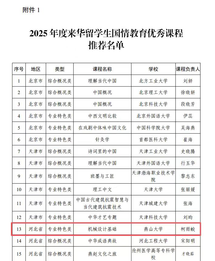 【新闻中心讯】近日,中国教育国际交流协会公布了2025年度来华留学生“了解中国”优秀课程与中外青少年社会实践活动基地的评选结果。我校申报的“来华留学生国情教育优秀课程”(专业特色类)——《机械设计基础》与“中外青少年社会实践活动基地”(历史文化类)——“燕山大学国际学生山海文脉美育实践基地”均获认定。